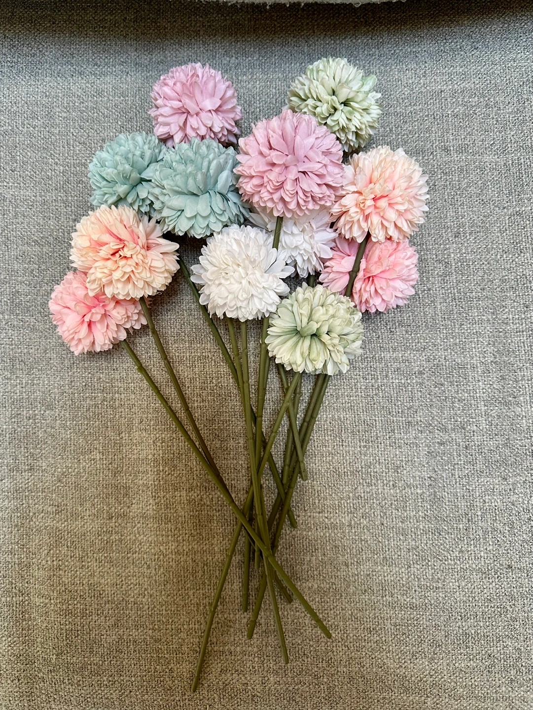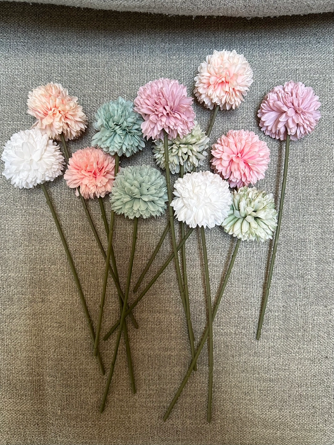 Twelve artificial flowers. Pastel pink, peach, white and green colours. Perfect for home décor.