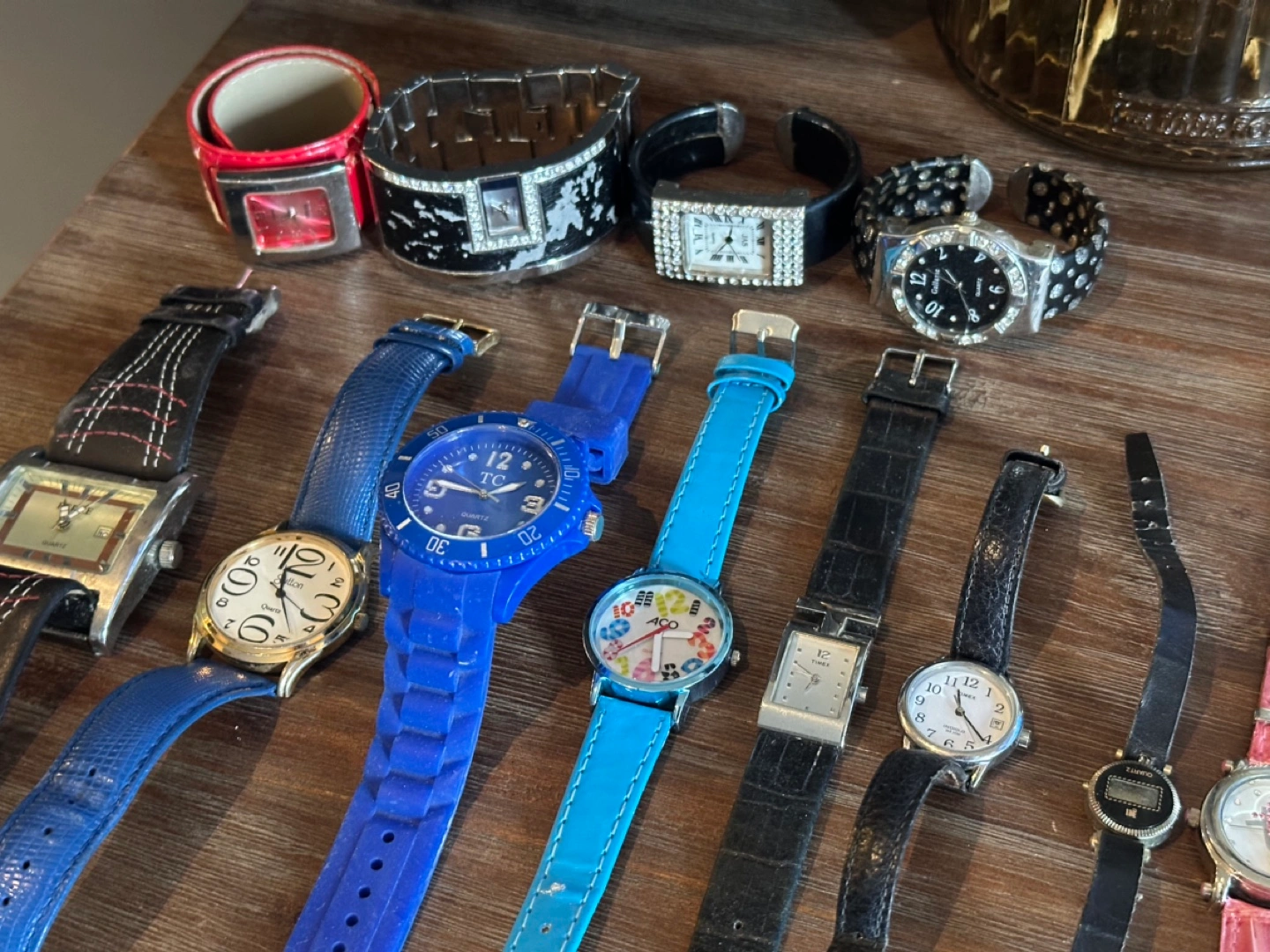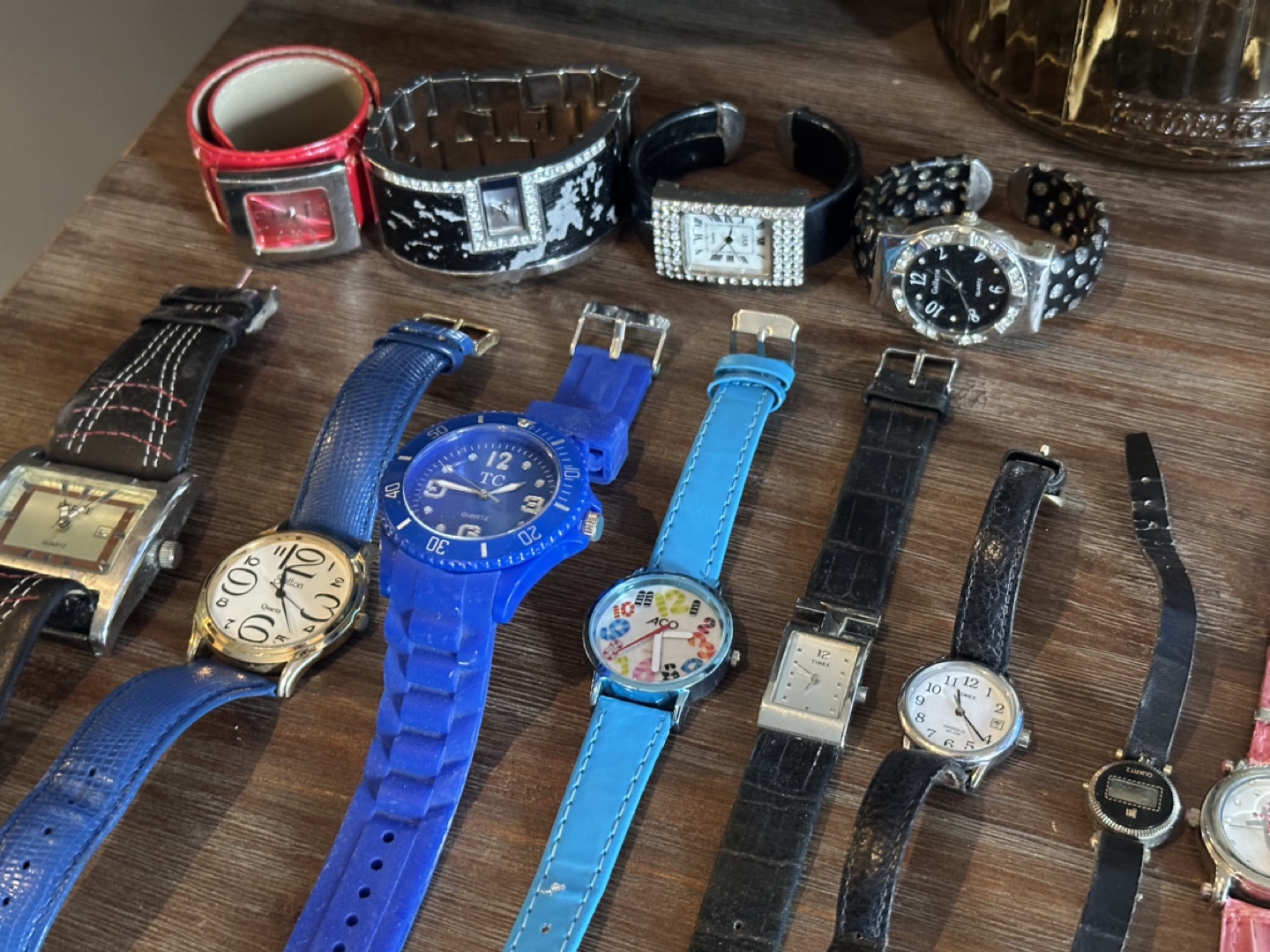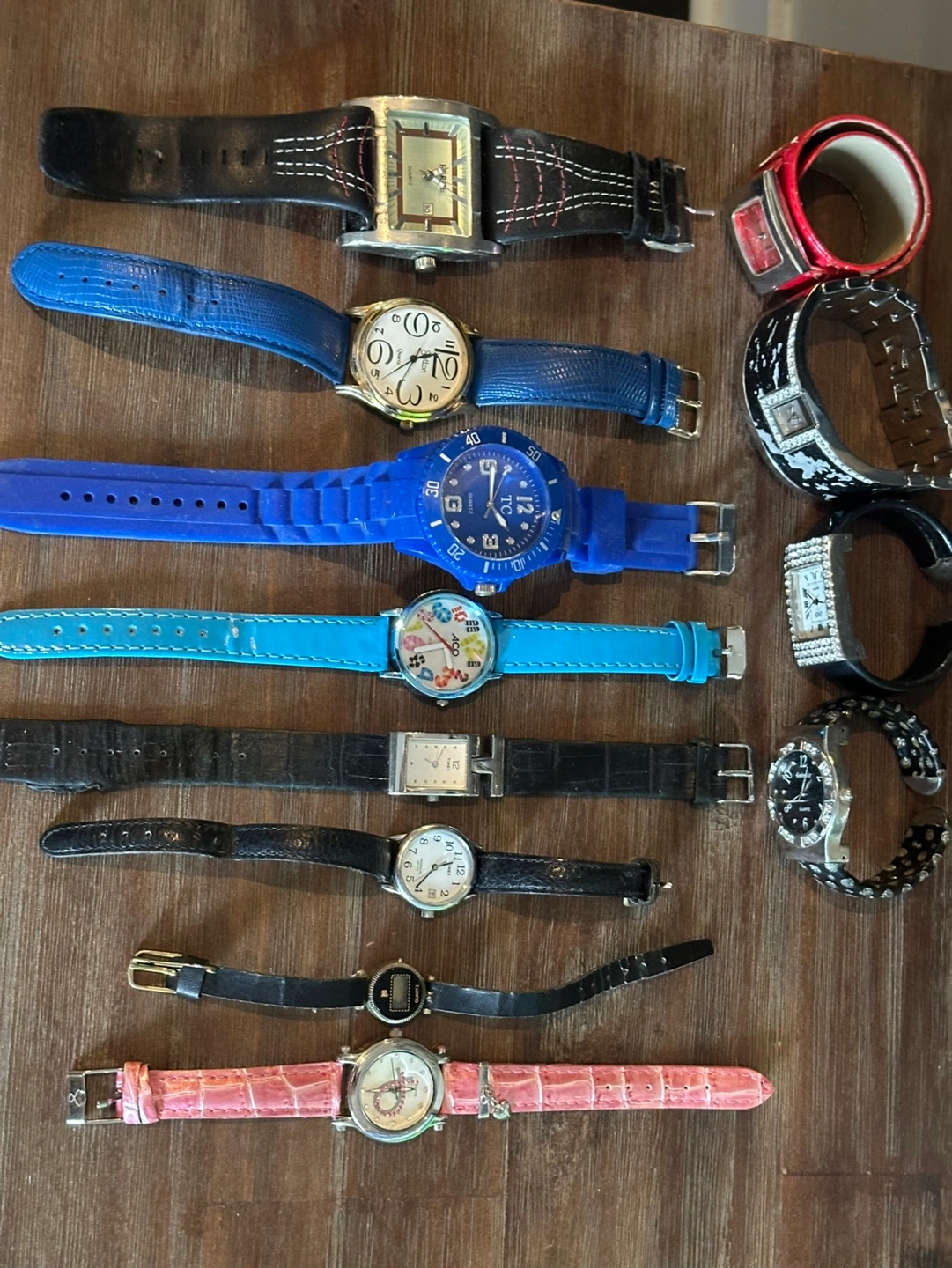 Large collection of pre-owned watches. Various styles and colours. Includes both wrist and cuff watches. Some leather bands, some silicone. Perfect for collectors or resellers or anyone looking for parts!