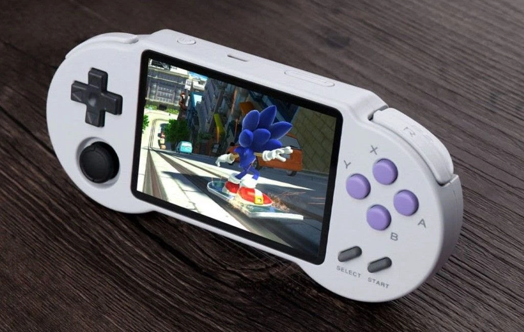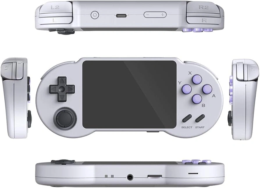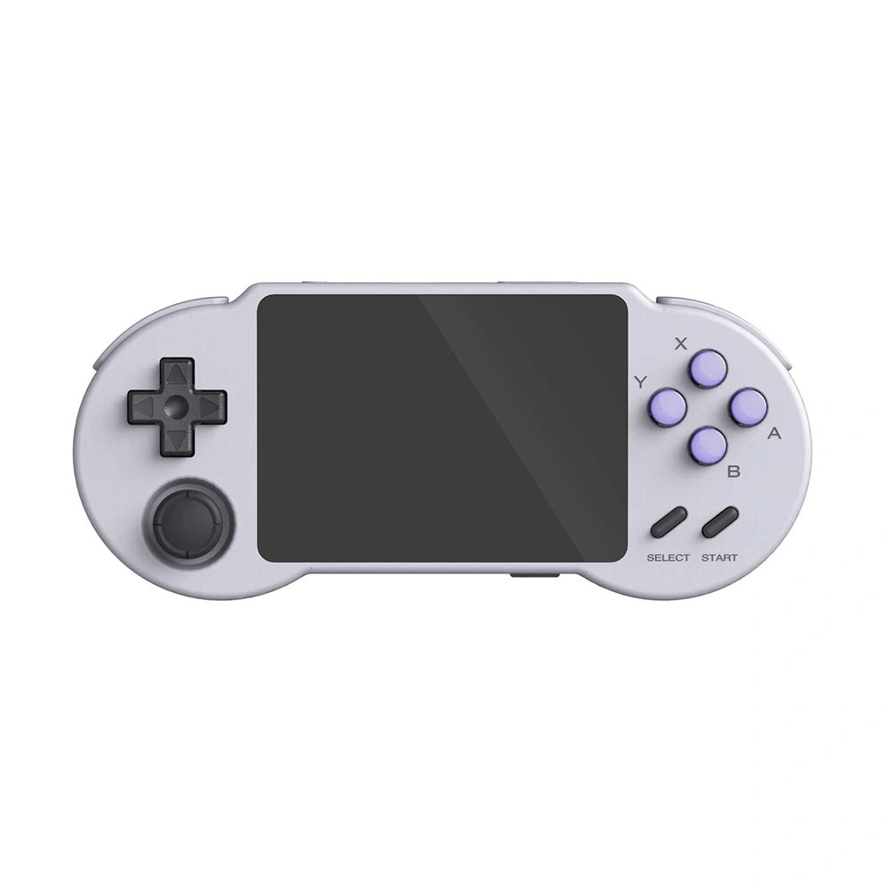Portable gaming device. Features a grey and off-white design. Includes directional pad, buttons, and analogue stick. Plays various games.