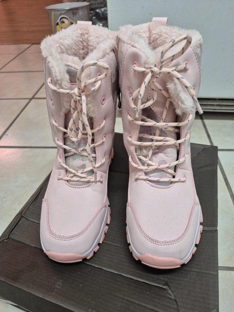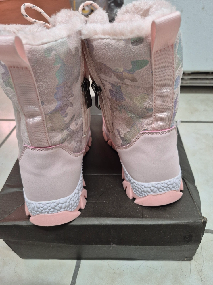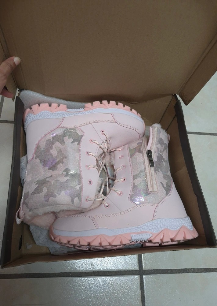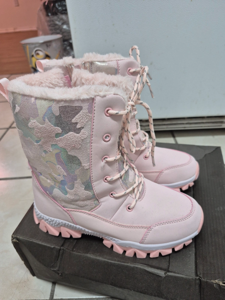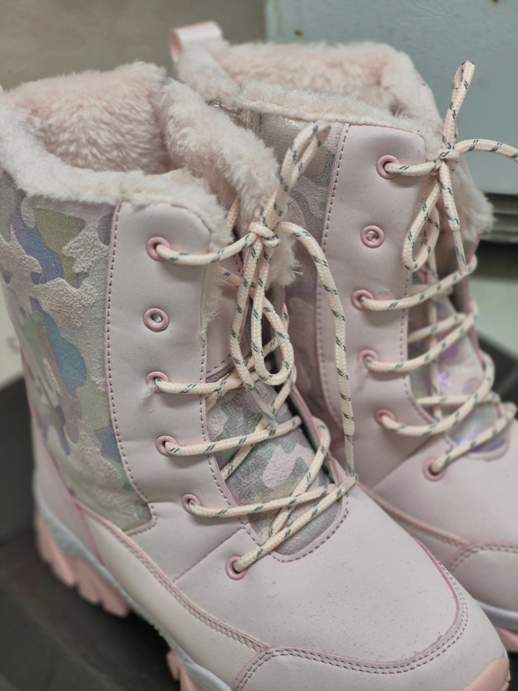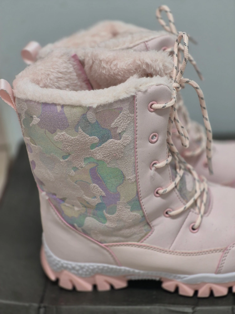 Cute pink winter boots. Lace-up style with a faux fur lining. Features a camo pattern detail. Durable sole with traction. Great for snow and ice.