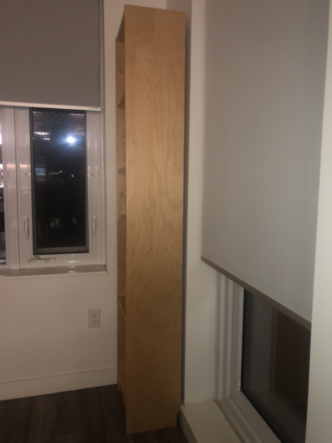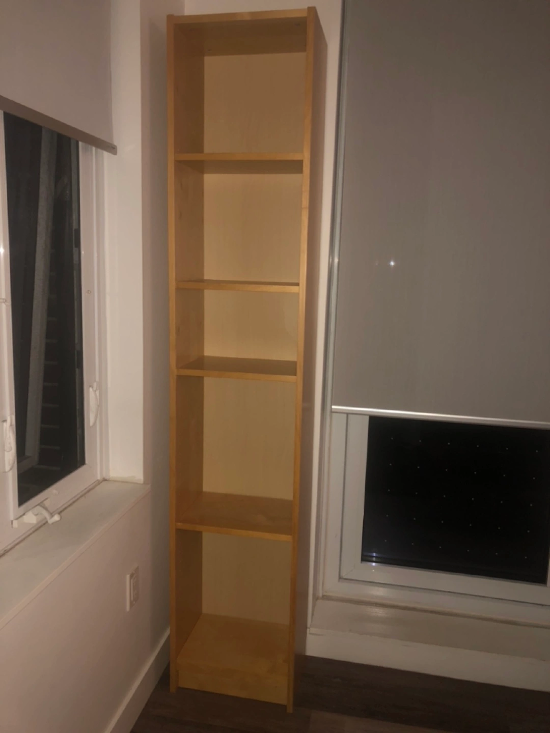 Slim, light-coloured wooden bookshelf. Five shelves offer ample storage. Perfect for a small space. Assembled and ready to use. Measures to approximately 11 by 16 by 78.5 inches