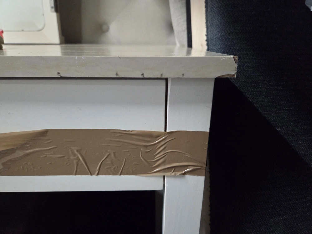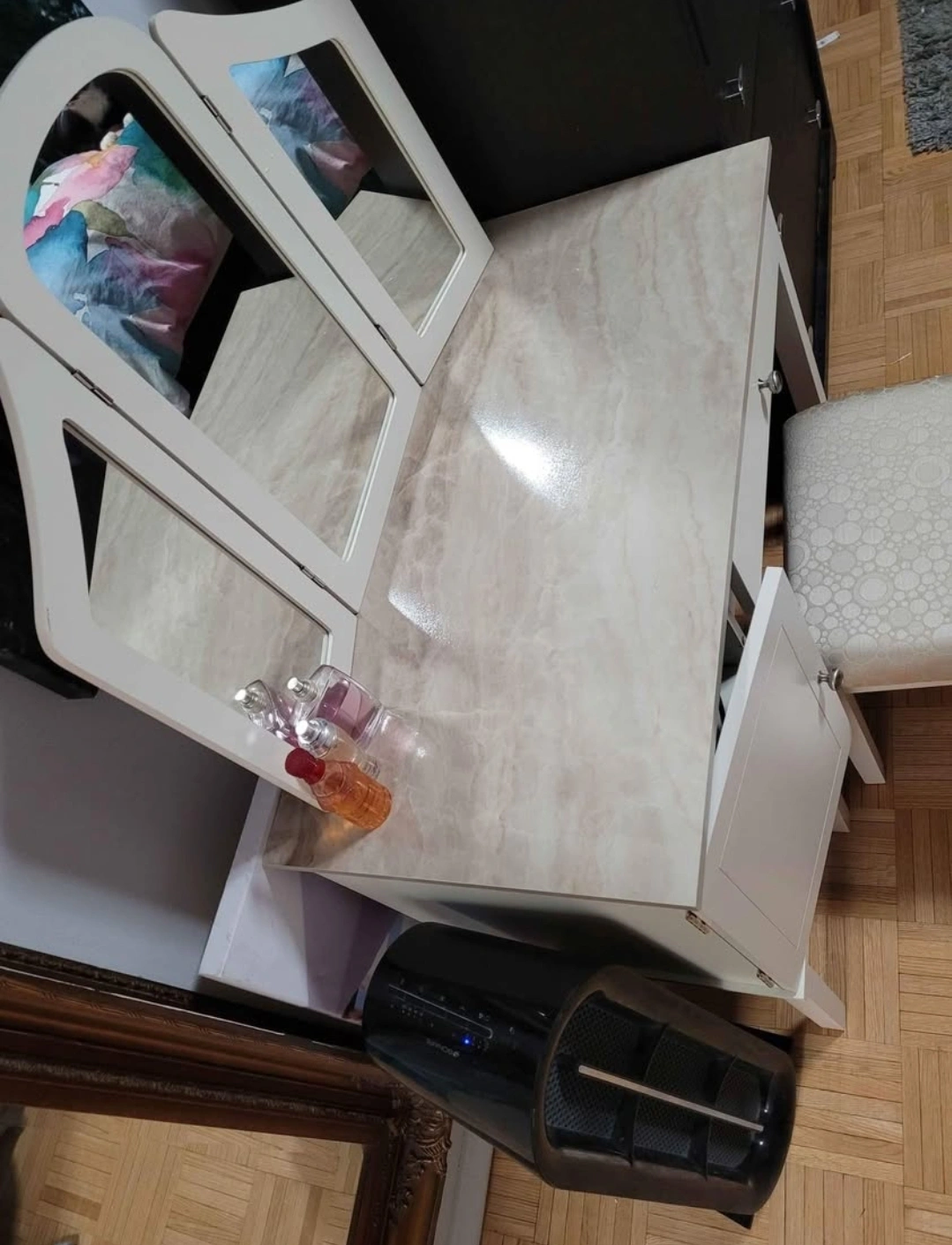 Marble-patterned countertop. Drawers and storage space. Great for makeup and organization.
