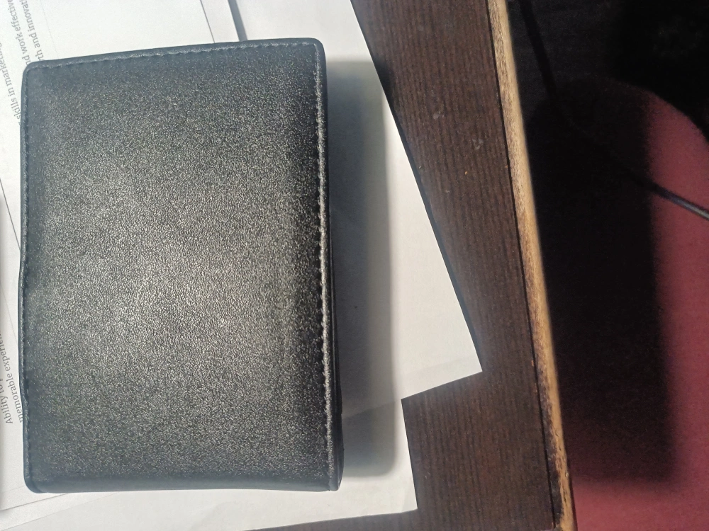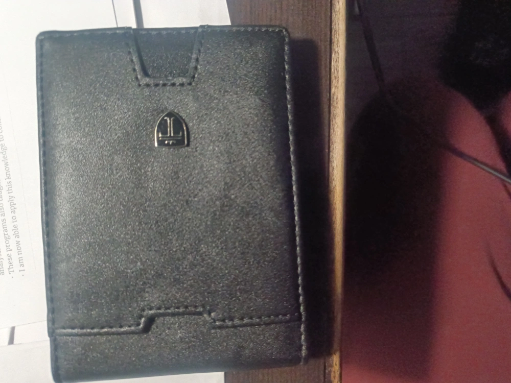 Slim black leather bi-fold wallet. Features a money clip and ID window. Minimalist design. Gently used.