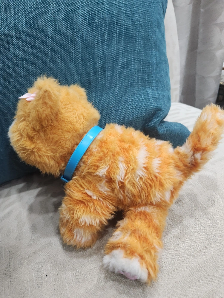 Adorable orange tabby kitten plush toy. Features a light blue collar and a grey tag. Interactive features. Gently used.