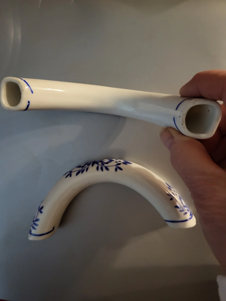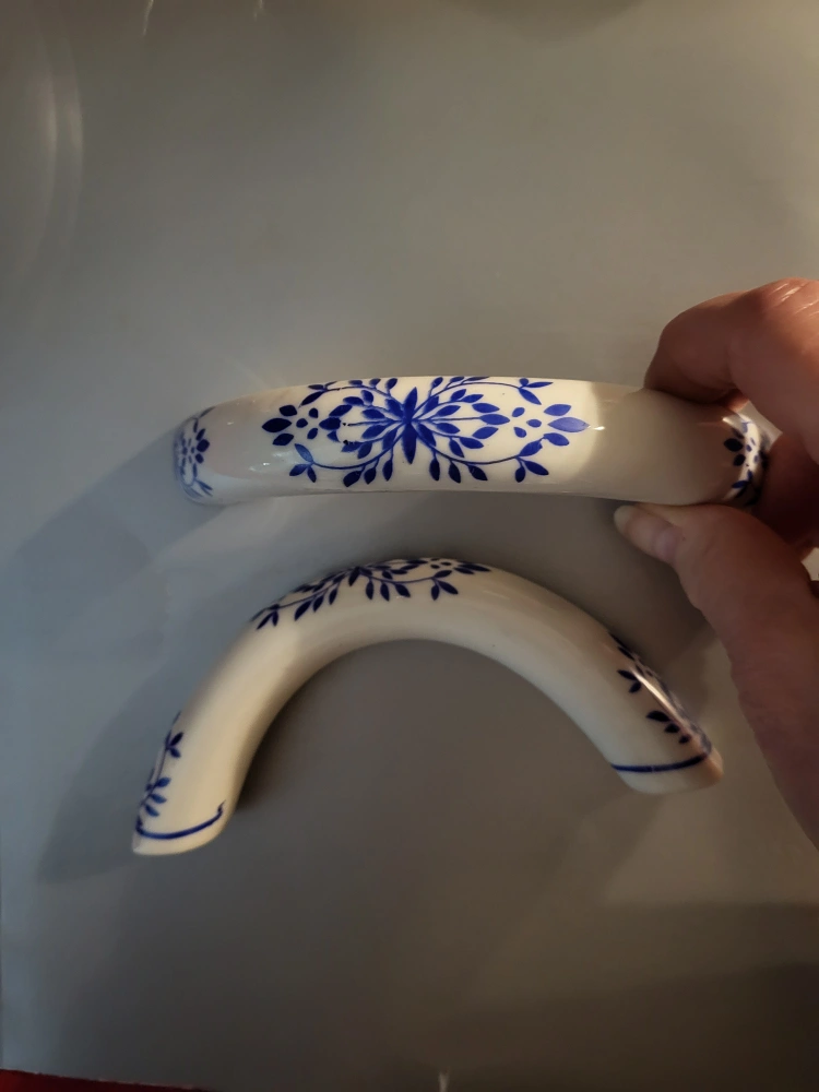 Pair of vintage porcelain drawer pulls. White with blue floral design. Unique and decorative. Perfect for restoration projects such as handles for baskets, adding character to furniture, etc.