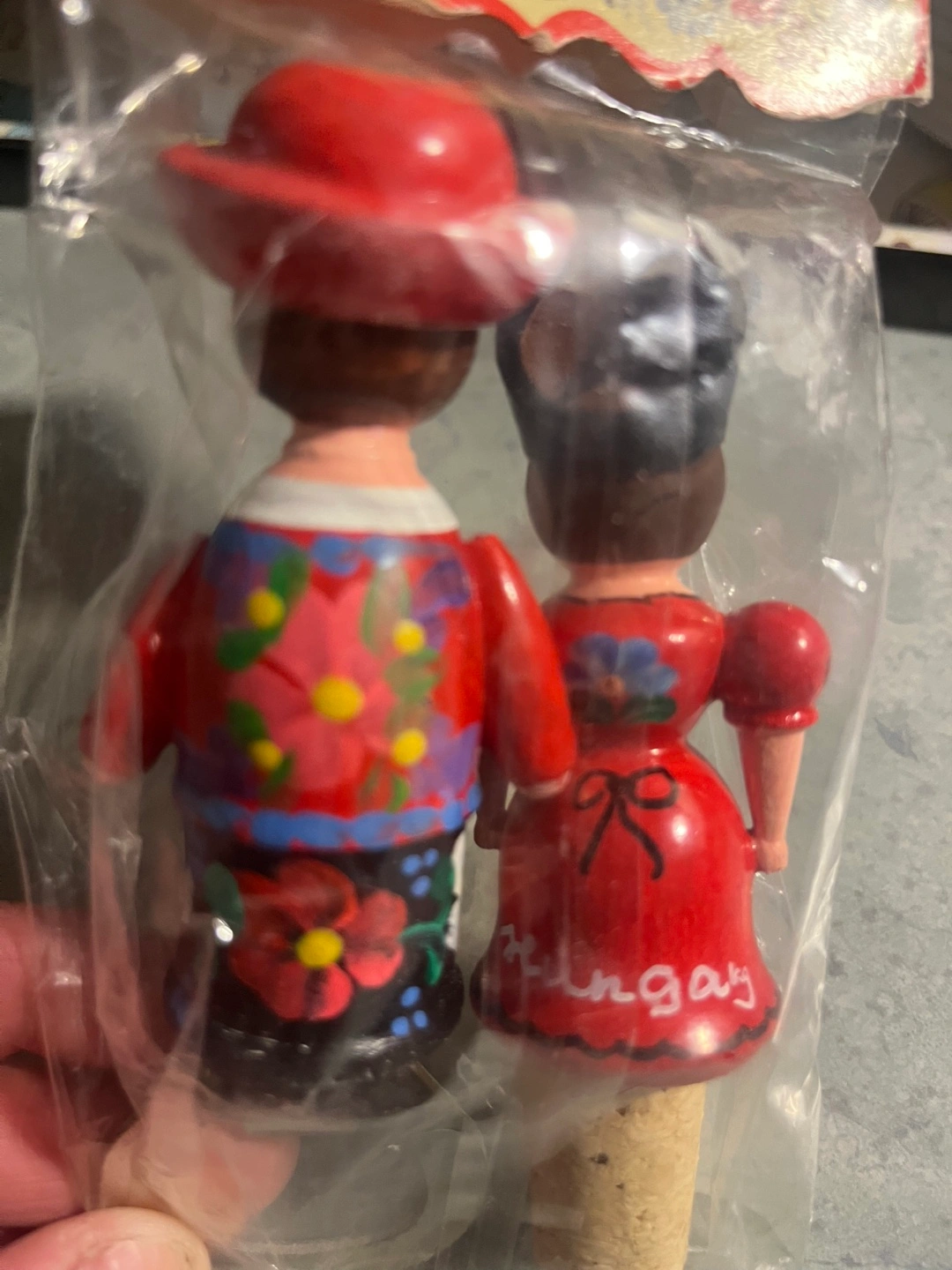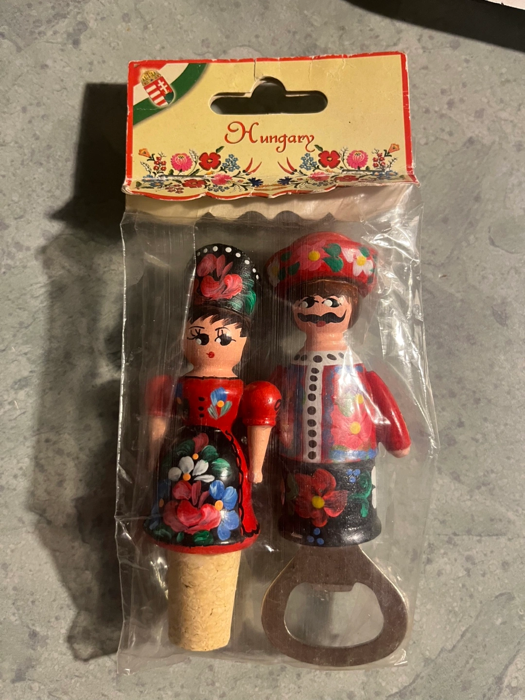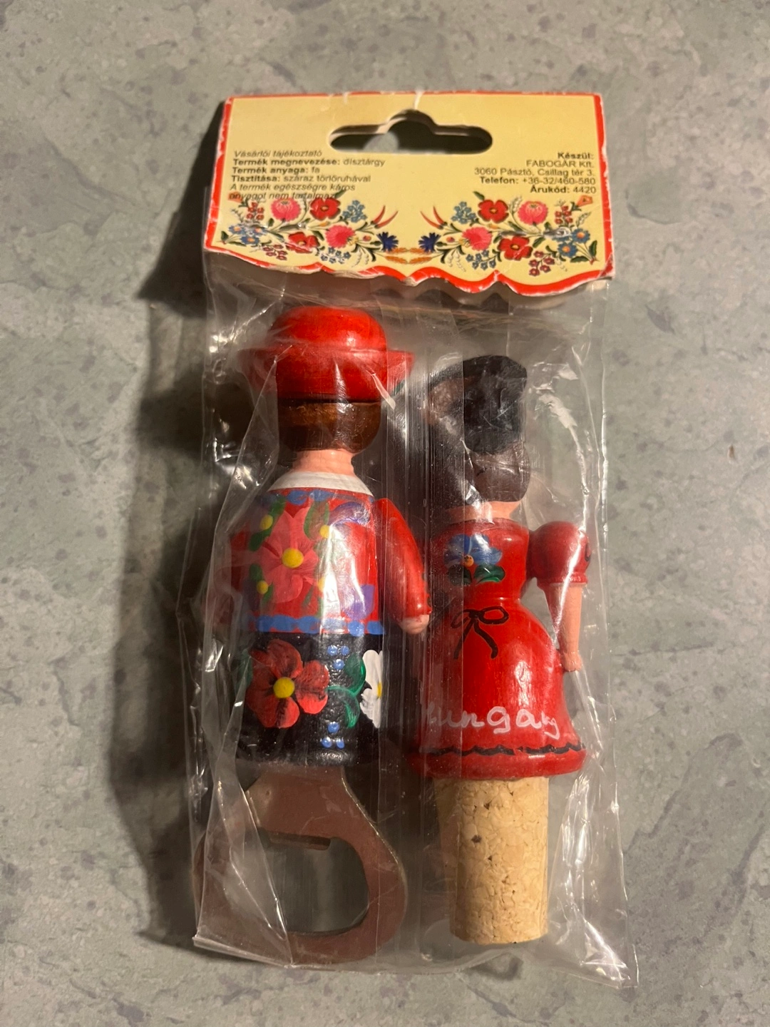 Hungary Folk Art Wine Cork And Bottle Opener. Adorable vintage set. Wooden figurines in traditional Hungarian folk costumes. One is a bottle stopper, the other a bottle opener. New, in original packaging.