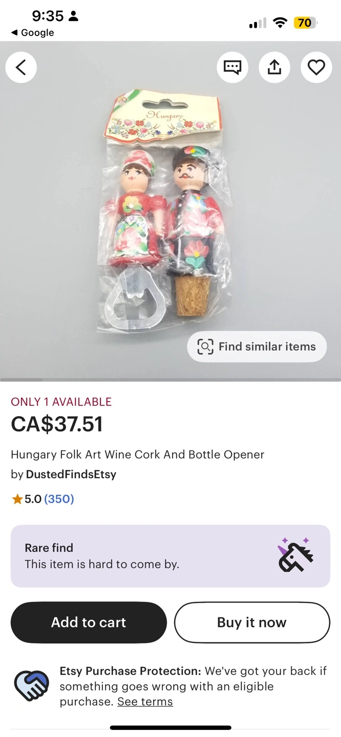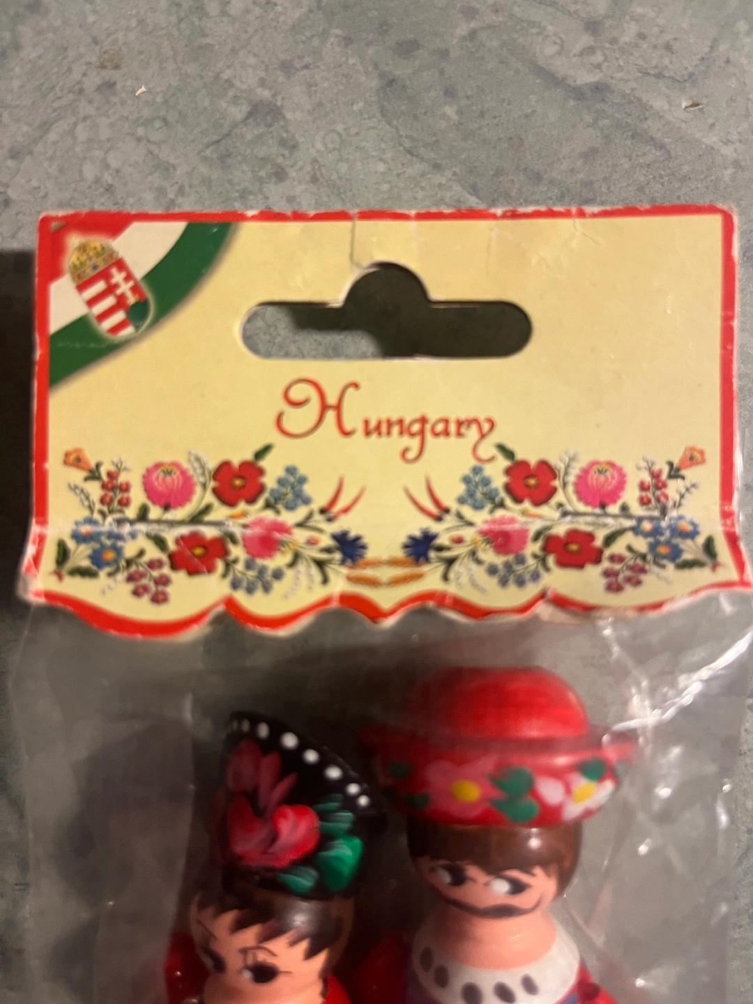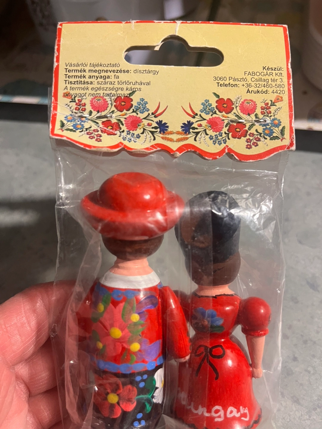 Hungary Folk Art Wine Cork And Bottle Opener. Adorable vintage set. Wooden figurines in traditional Hungarian folk costumes. One is a bottle stopper, the other a bottle opener. New, in original packaging.