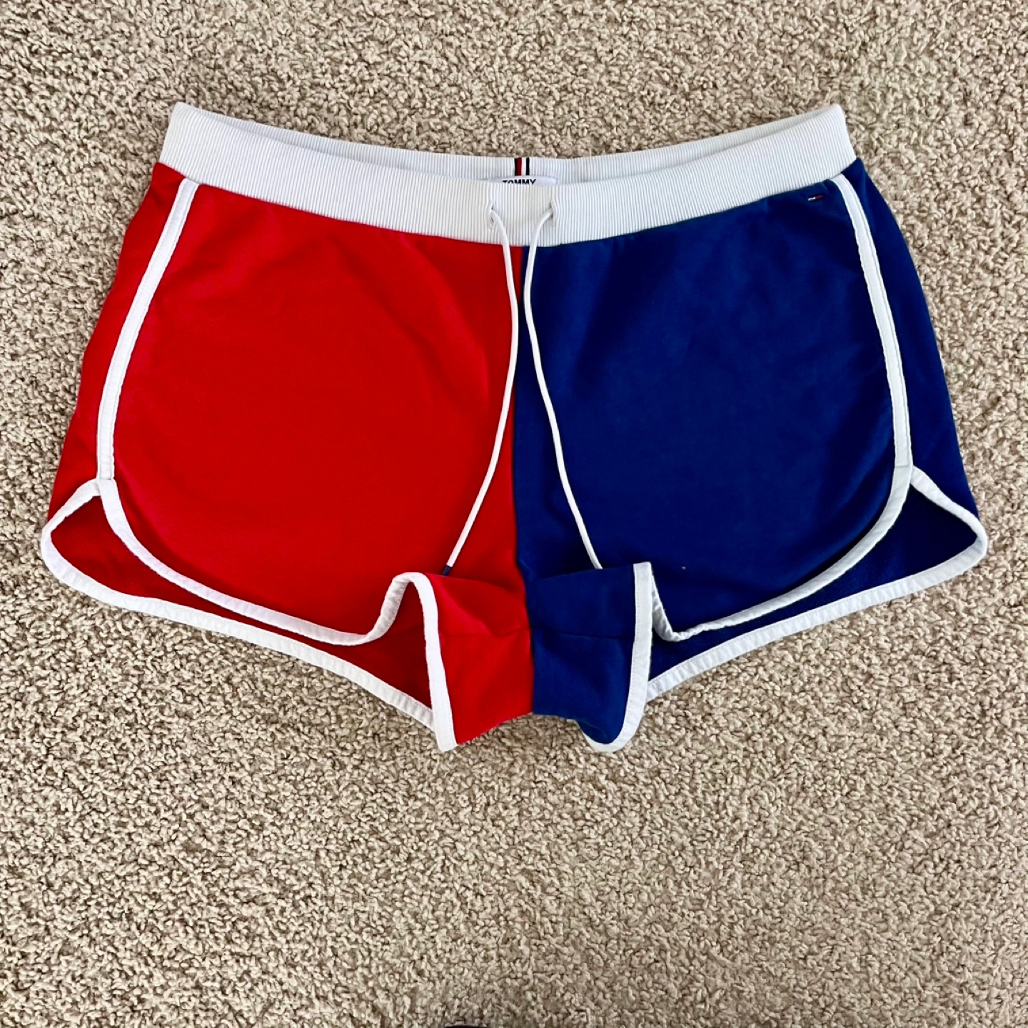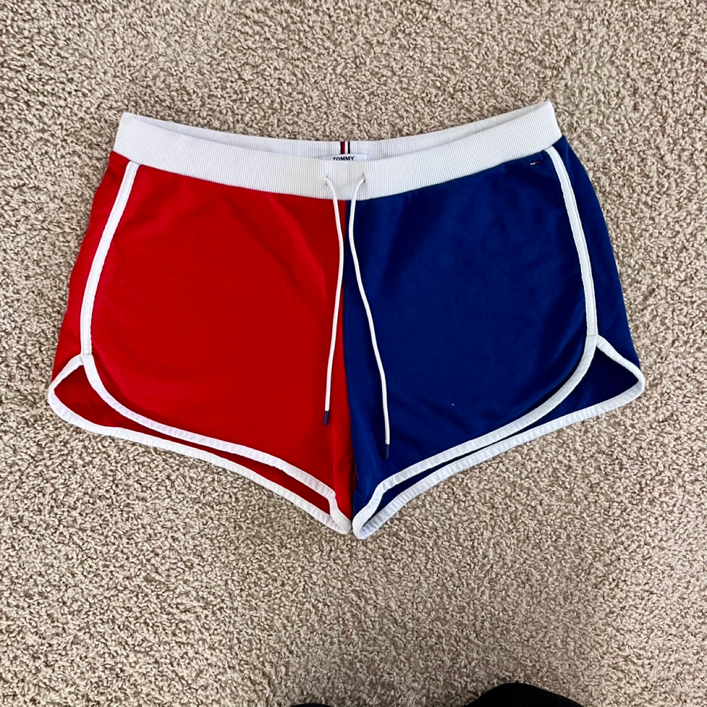 Women's Tommy Hilfiger shorts. Red and blue colour block design. White side stripes. Drawstring waist. Minor flaws as shown.