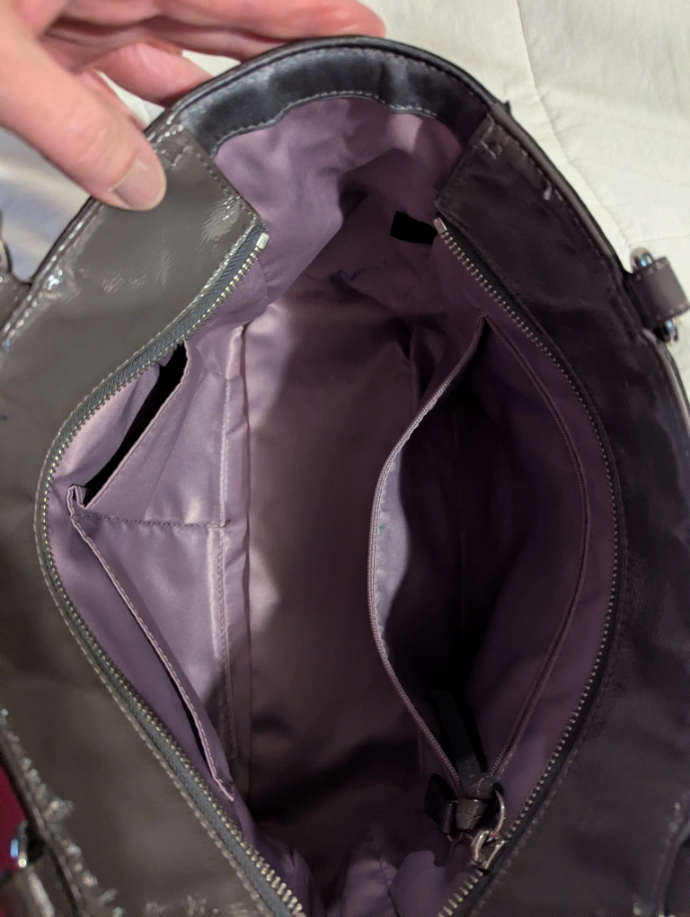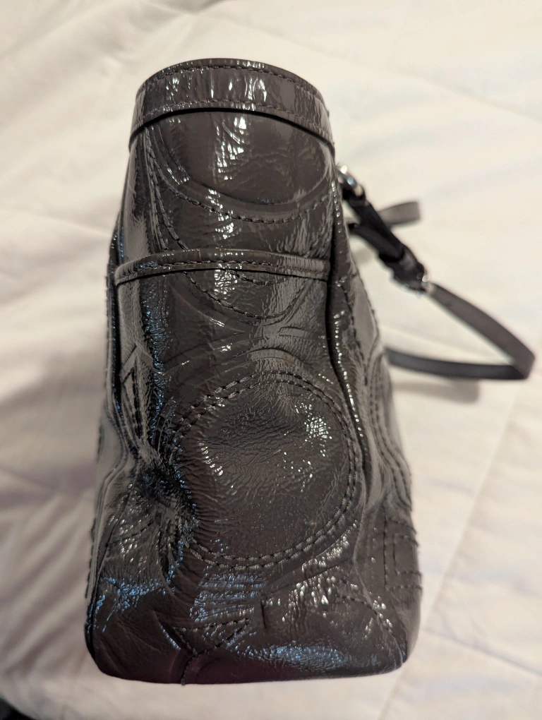 Gun metal grey patent leather bag. Features Coach logo pattern. Purple lining with 3 interior pockets. No staining or scratches. Pre-owned.