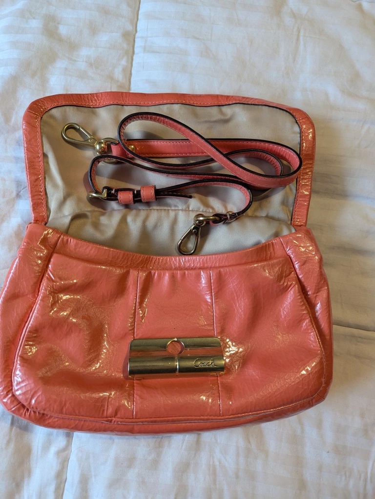 Pre-owned Coach shoulder bag. Coral patent leather. Gold-tone hardware. Interior pockets. Removable shoulder strap. Small, stylish handbag. A rare find and just in time for spring.