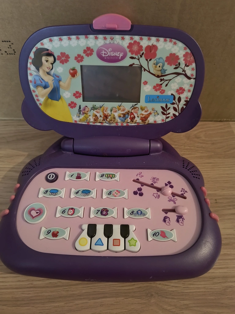 Vintage Snow White themed children's toy laptop. Features a screen, buttons, and sound.