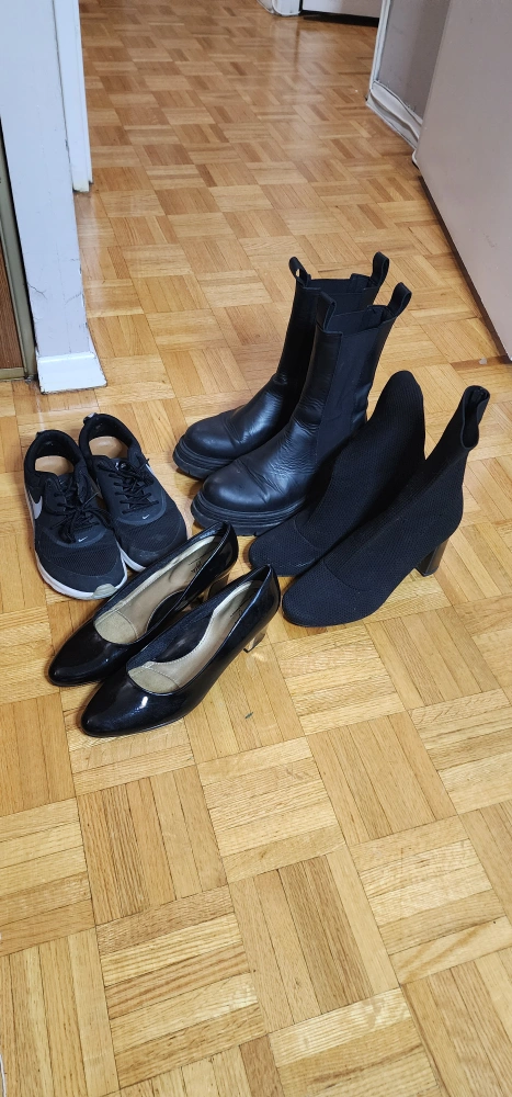 Pair of black faux leather ankle boots. Chunky sole. Elastic side panels. Good for fall and winter.