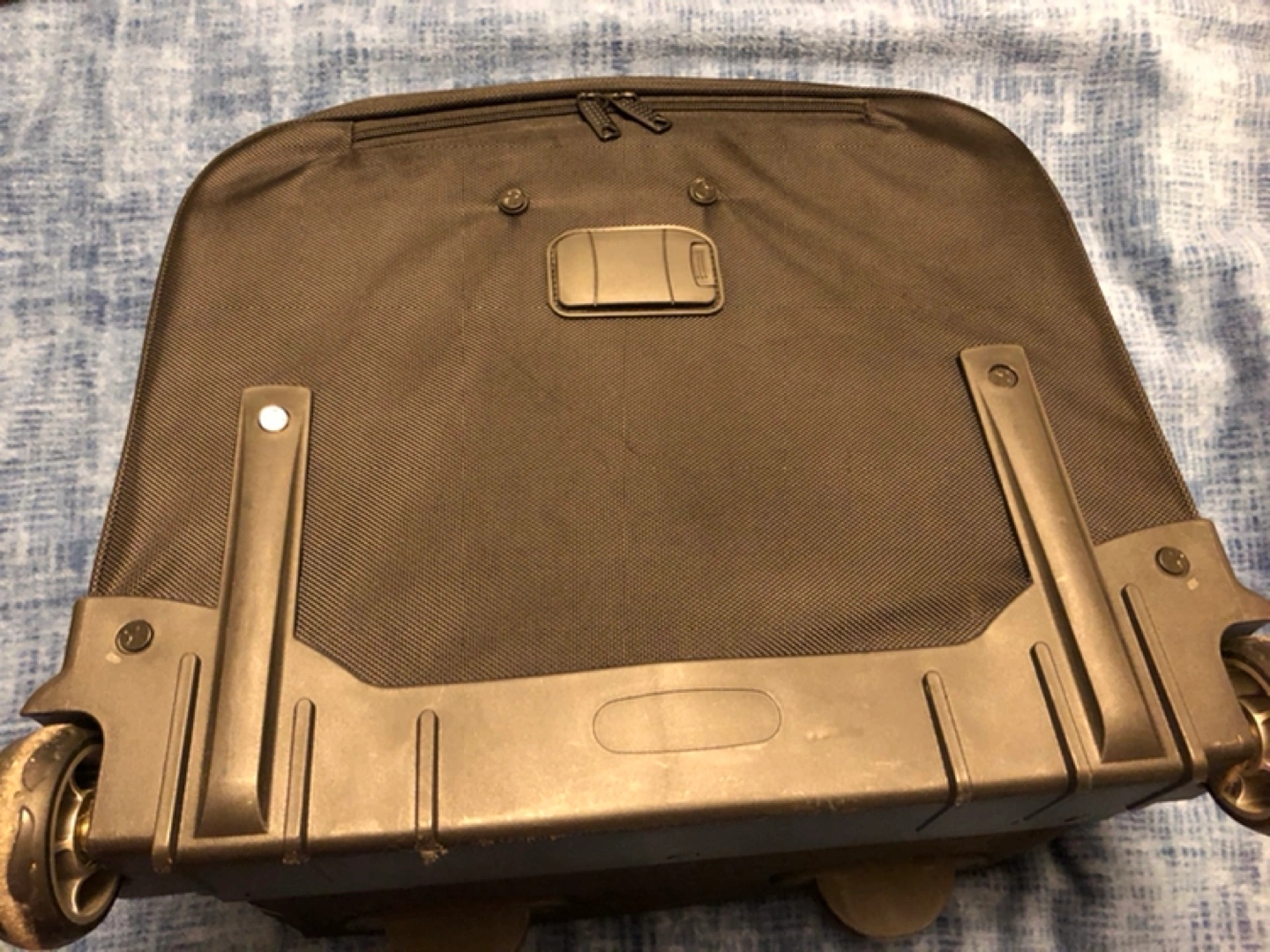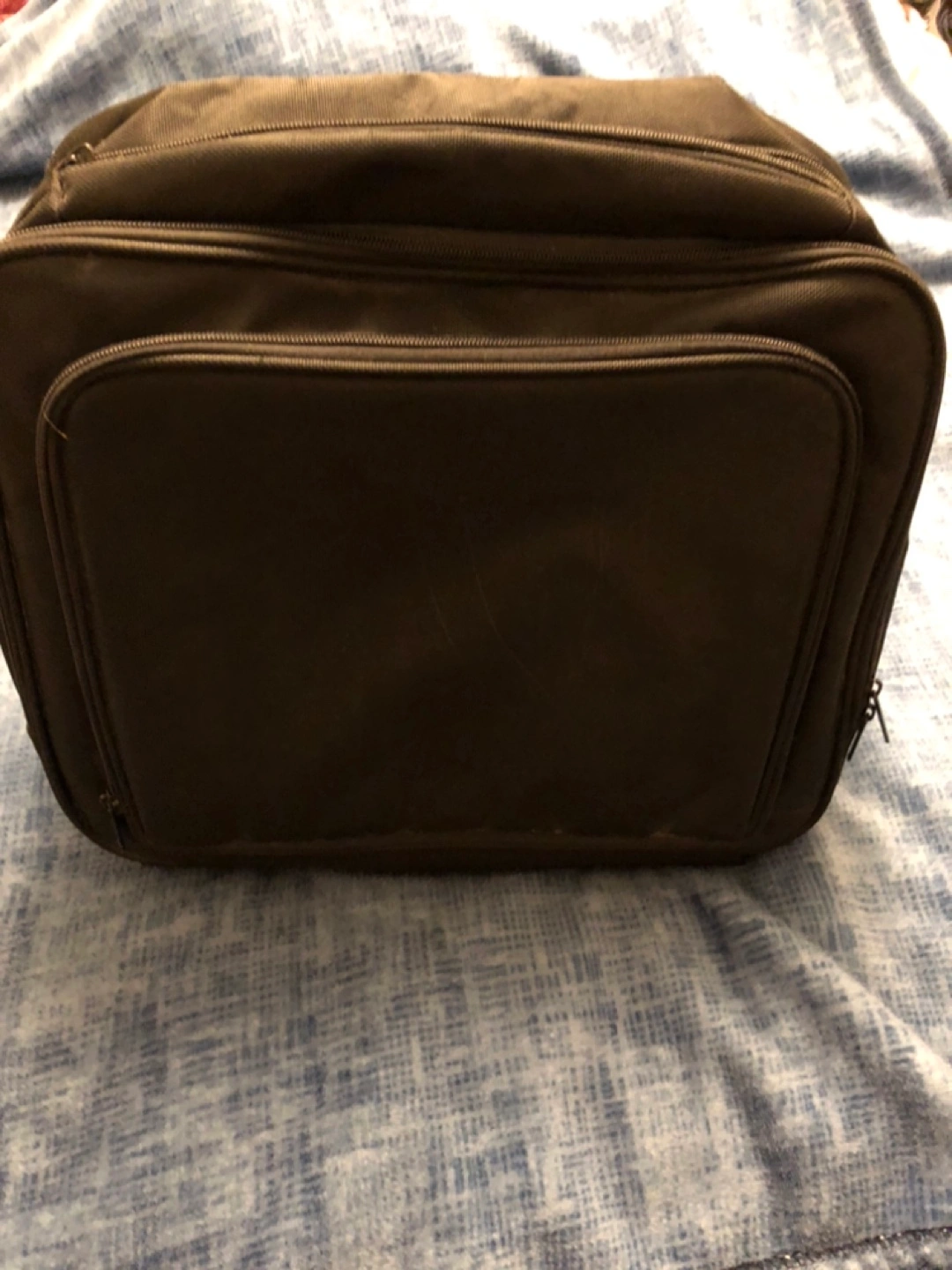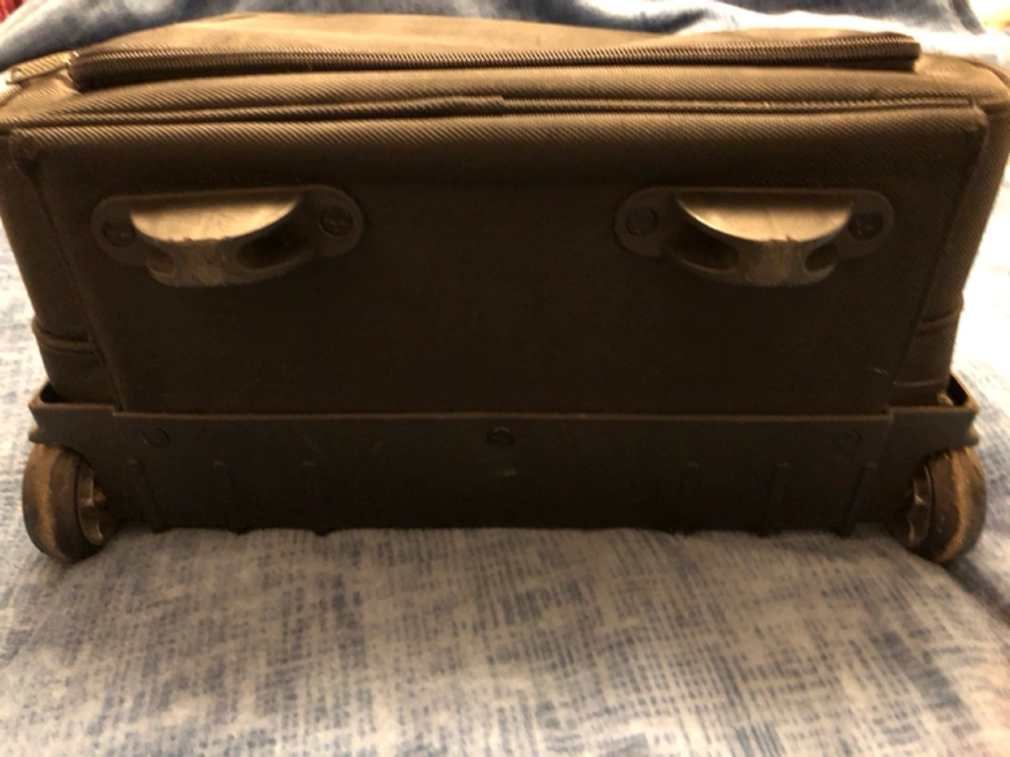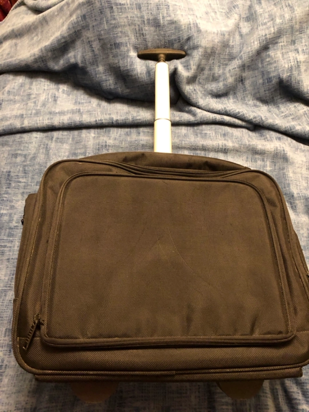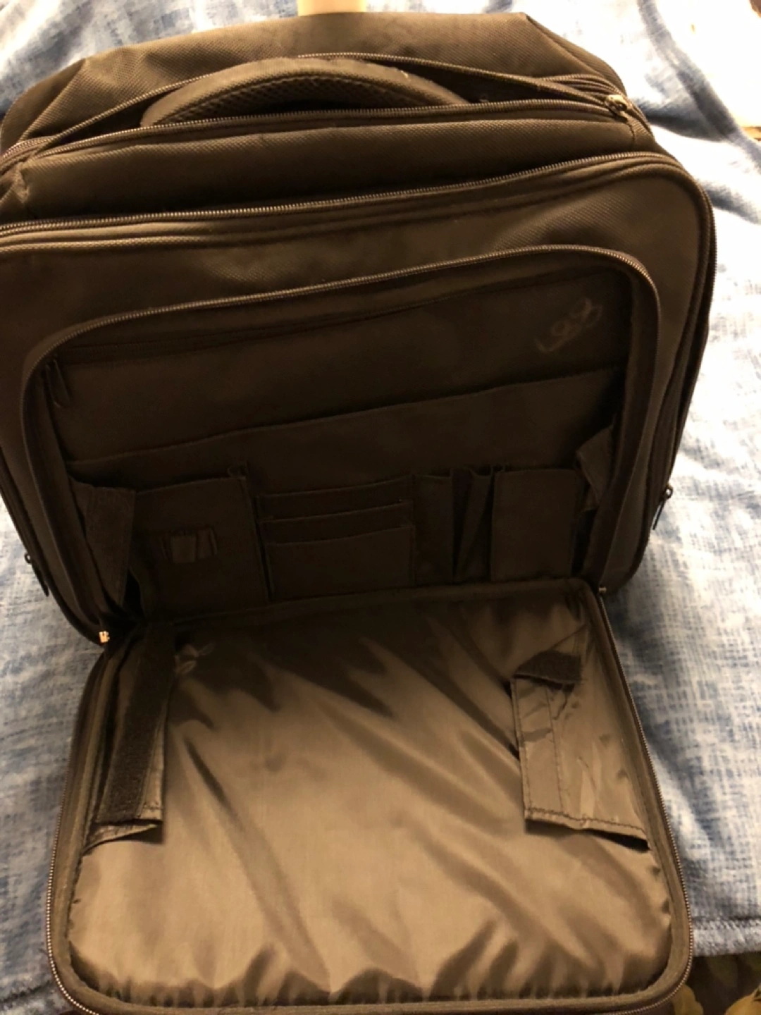 Black rolling laptop bag. Features multiple interior compartments and a padded laptop sleeve. Durable exterior. Wheels and retractable handle for easy transport.