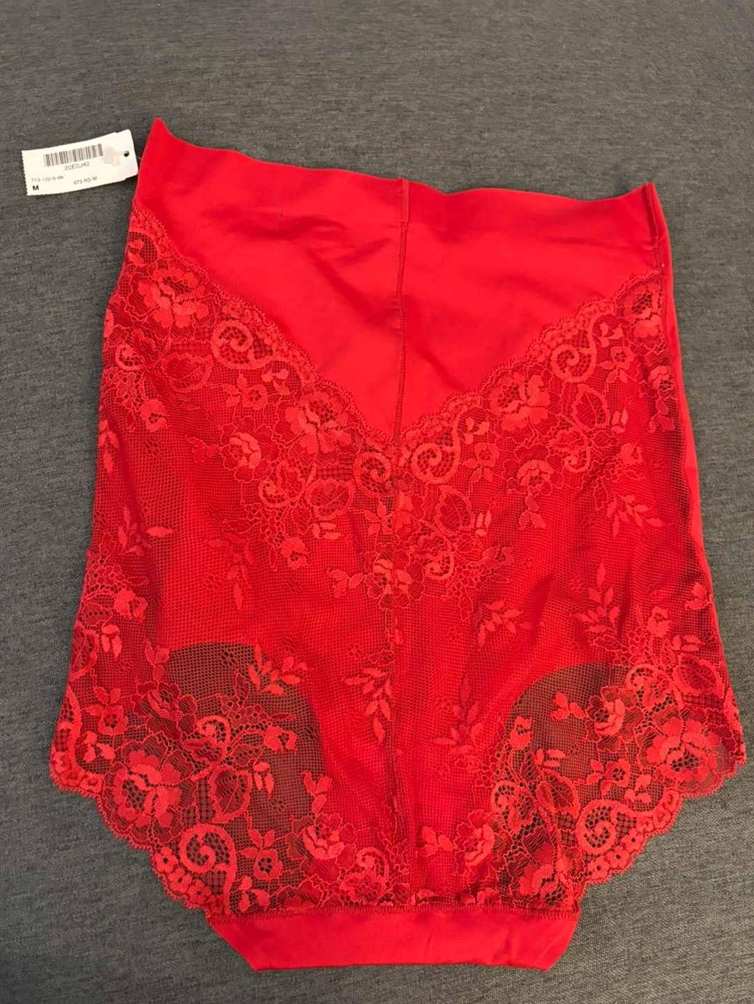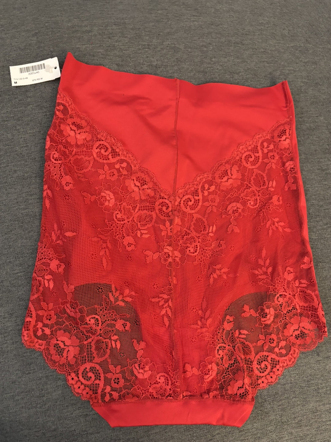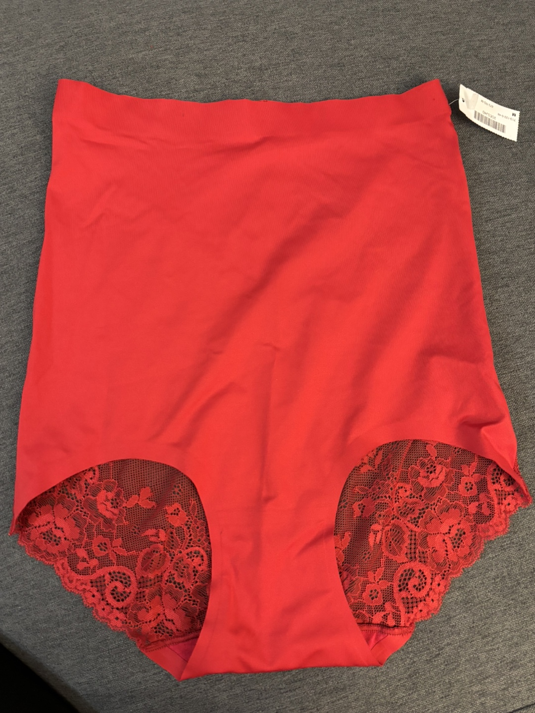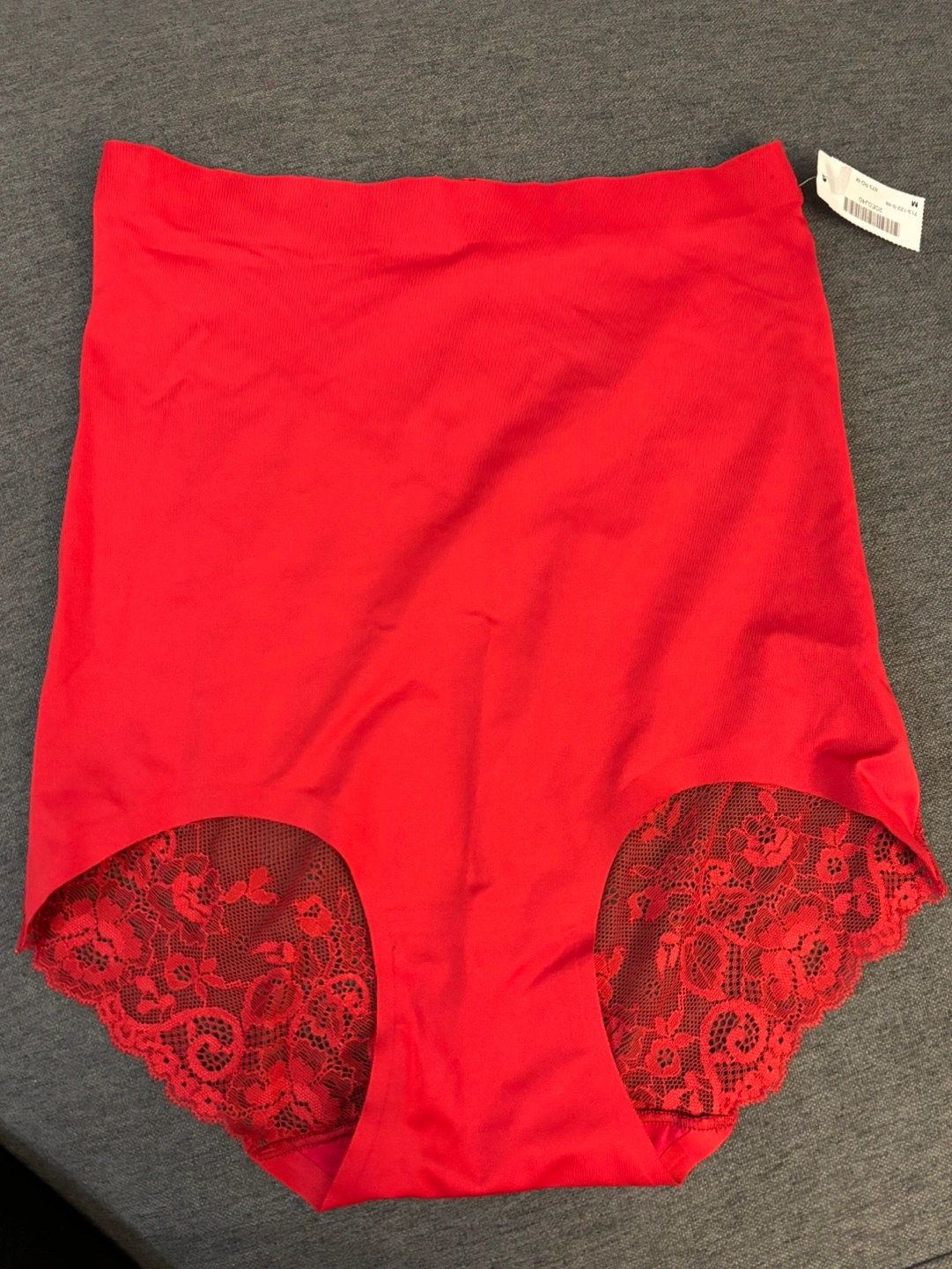 Red high-waisted briefs. Features delicate lace trim. Size medium. New with tags.