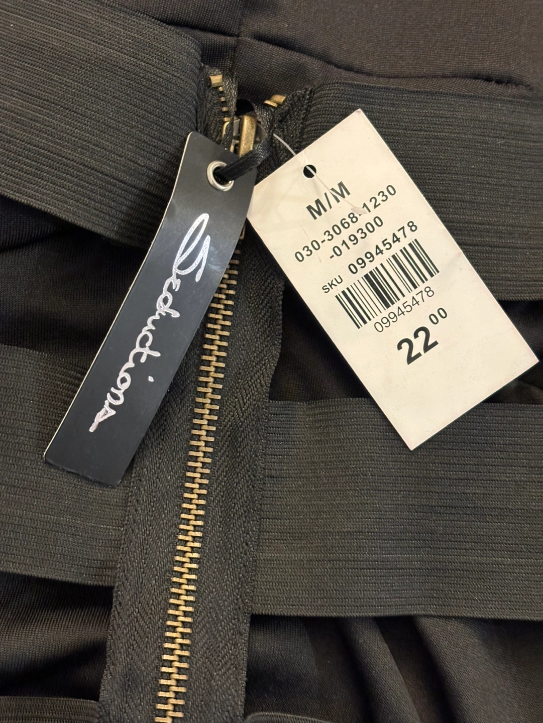 Form-fitting strapless mini dress. Features a ruched bodice and mesh fabric. Back zipper closure. Elasticated bands across the bodice. Size M/M.