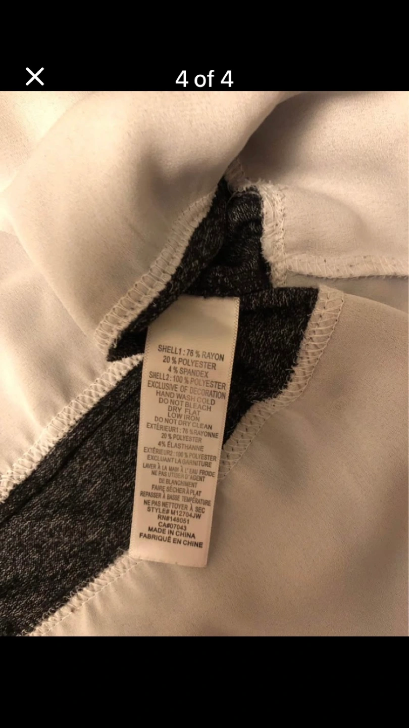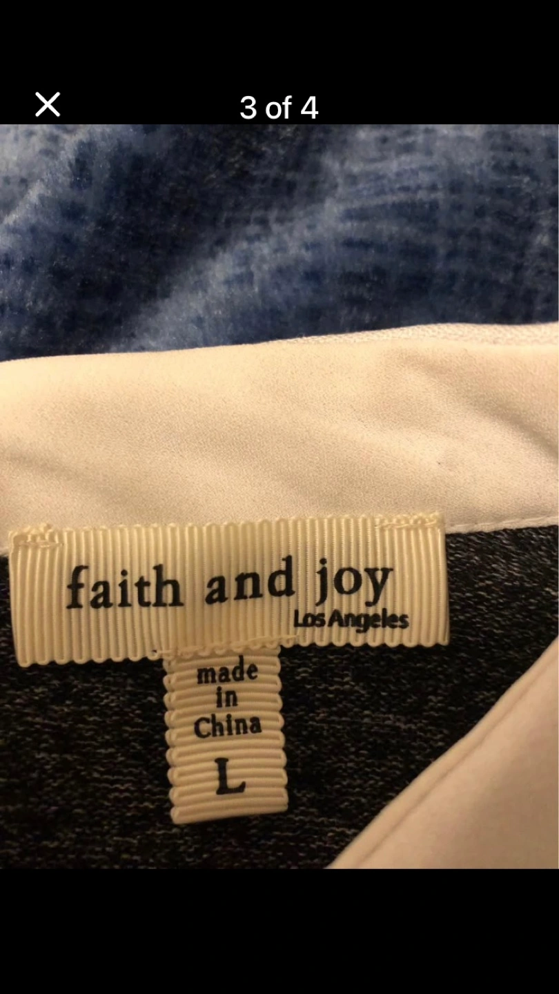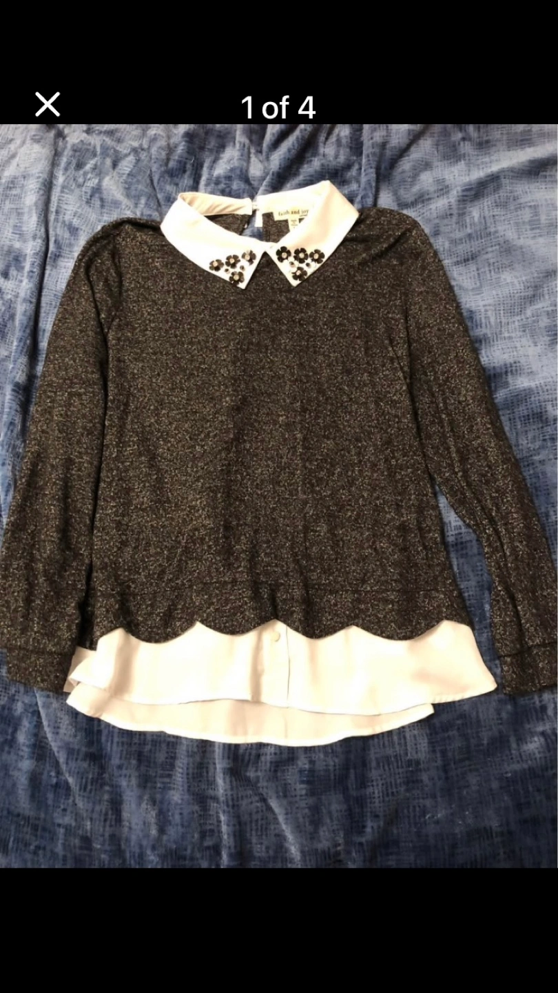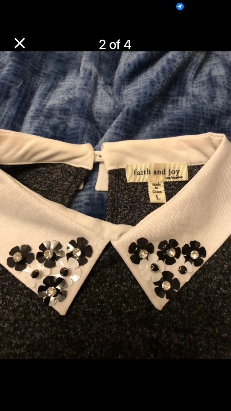 Grey and white long sleeve top. Features a contrasting white Peter Pan collar adorned with black and silver sparkly flower embellishments. Scalloped hem. Size L.