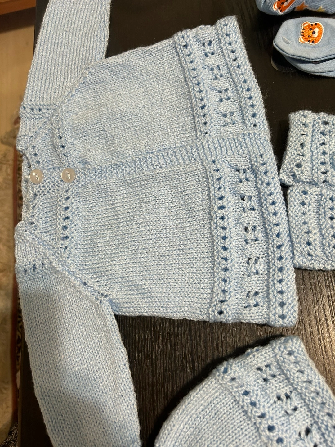 Adorable light blue hand-knitted baby boy outfit. Includes a cardigan sweater, matching hat, booties, and mittens. Perfect for newborn photos or a special occasion. Delicate detailing throughout.