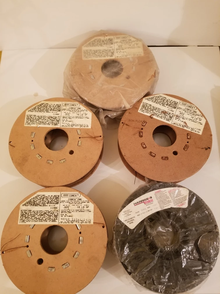 Five spools of welding wire. Various sizes and types. Brands include Corex and Harris Welco.