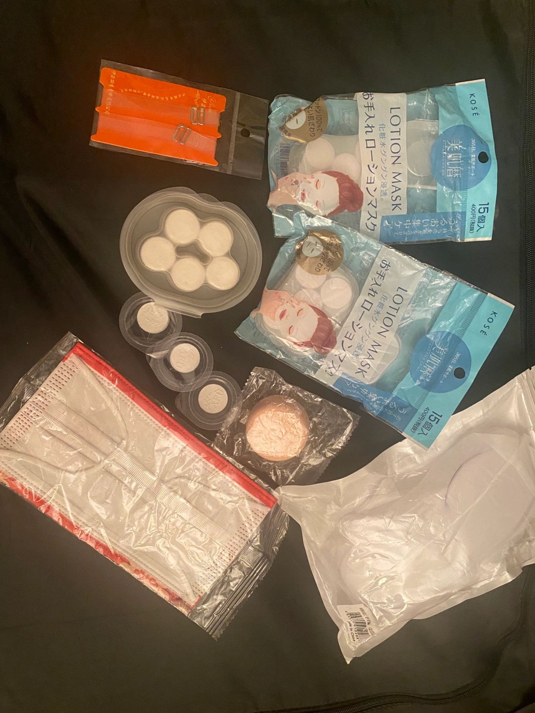 Assorted beauty products including Kosé lotion masks, face mask, cleansing cotton rounds, and bra straps.