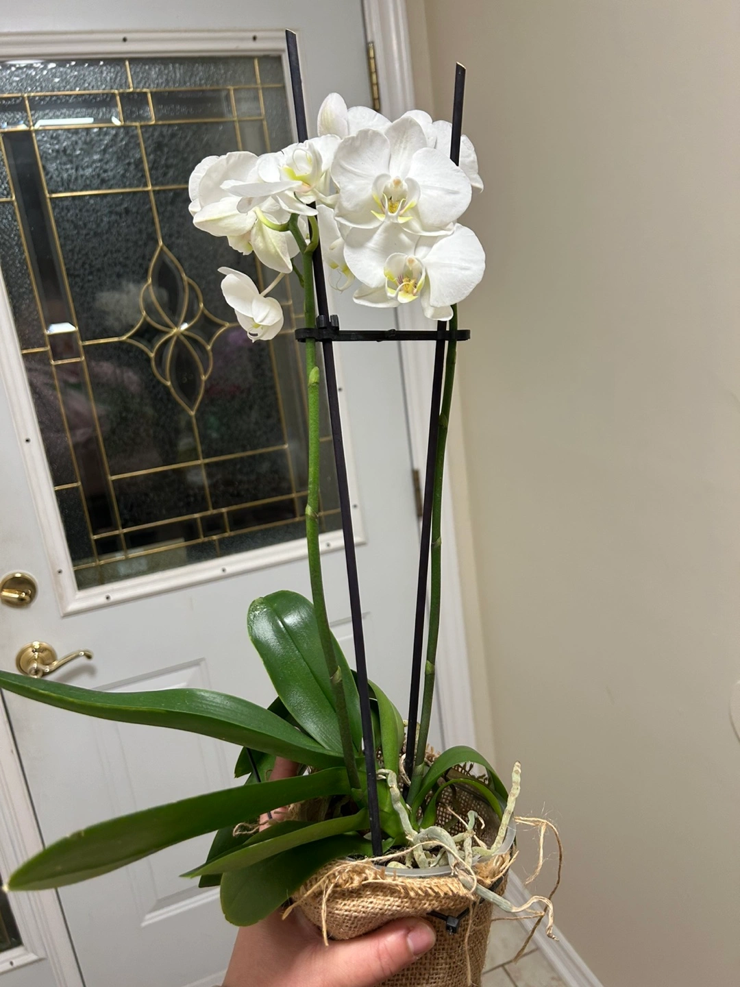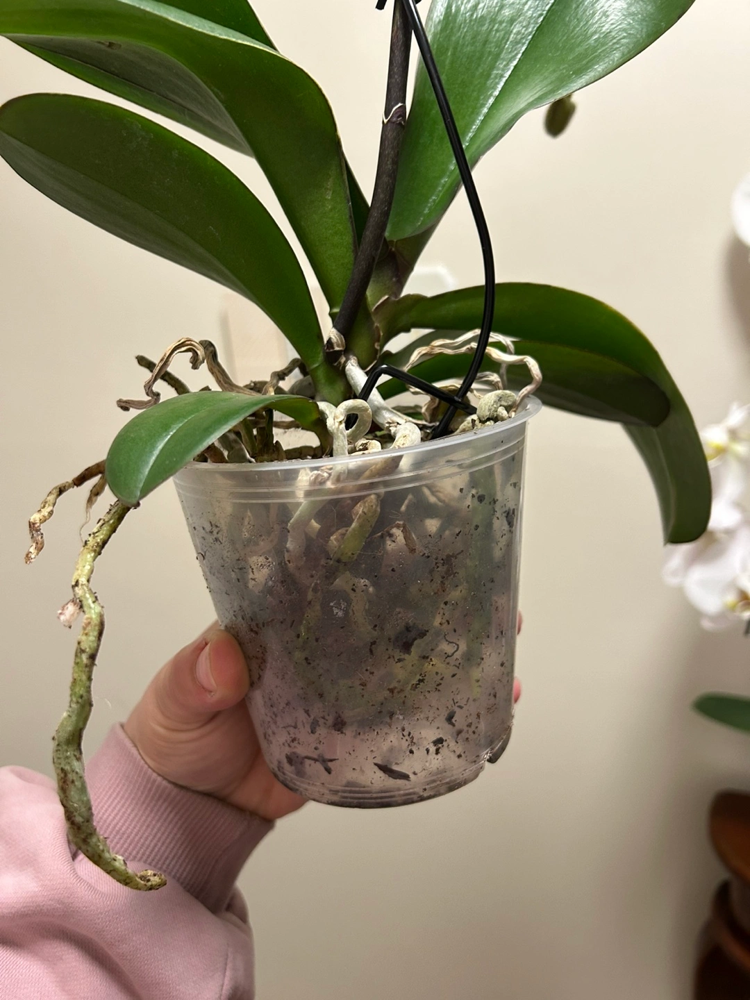 Beautiful white Phalaenopsis orchid. Multiple blooms. Healthy roots. Potted in clear plastic container. Just repotted in orchid mix (not shown in picture)