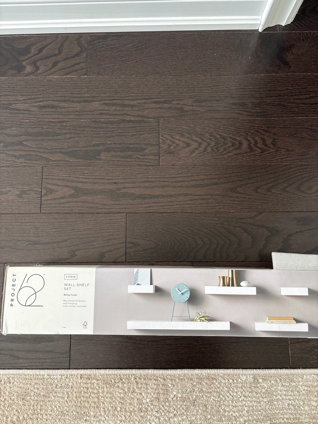 43New in box. Three-piece floating shelf set. White finish. Includes hardware for mounting. Various sizes included.