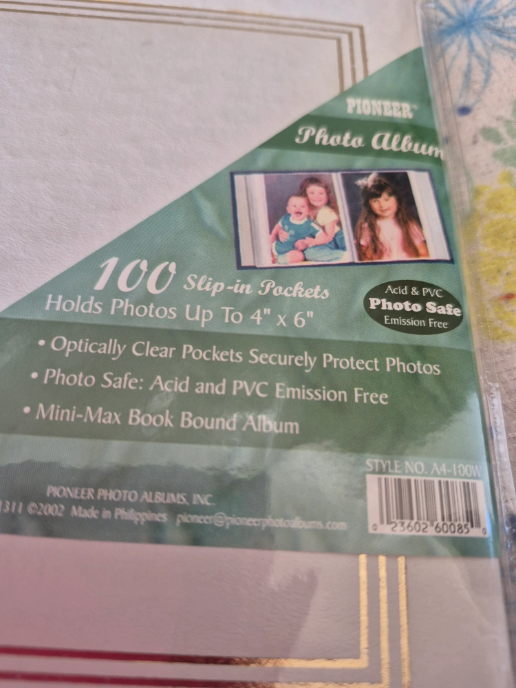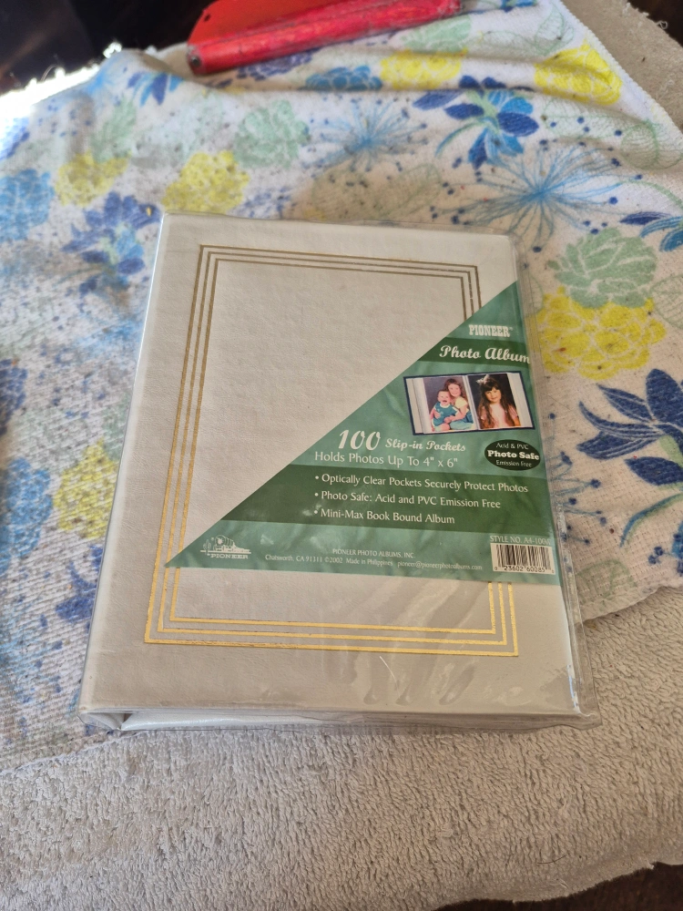 New photo album. Holds 100 photos up to 4" x 6". Optically clear pockets. Acid and PVC emission free. Mini-max book bound album.