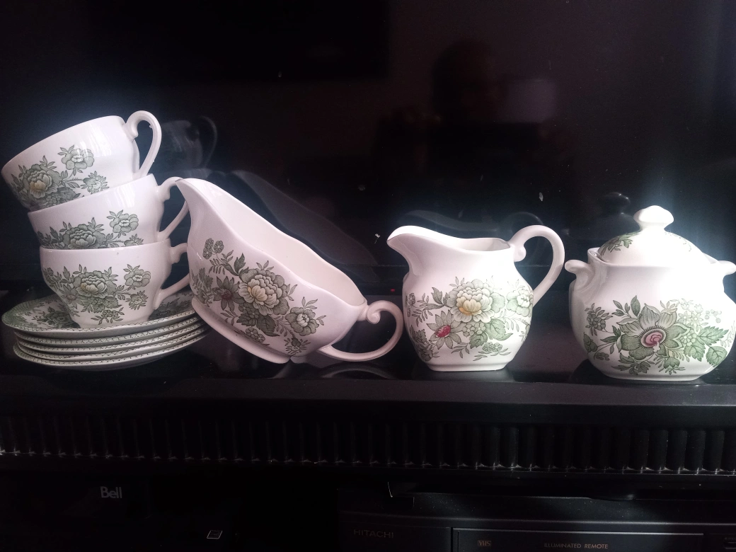 "Vintage Wedgwood" Beautiful vintage tea set. Includes three teacups, five saucers, creamer, sugar bowl, and gravy boat. Green floral pattern. Excellent condition.