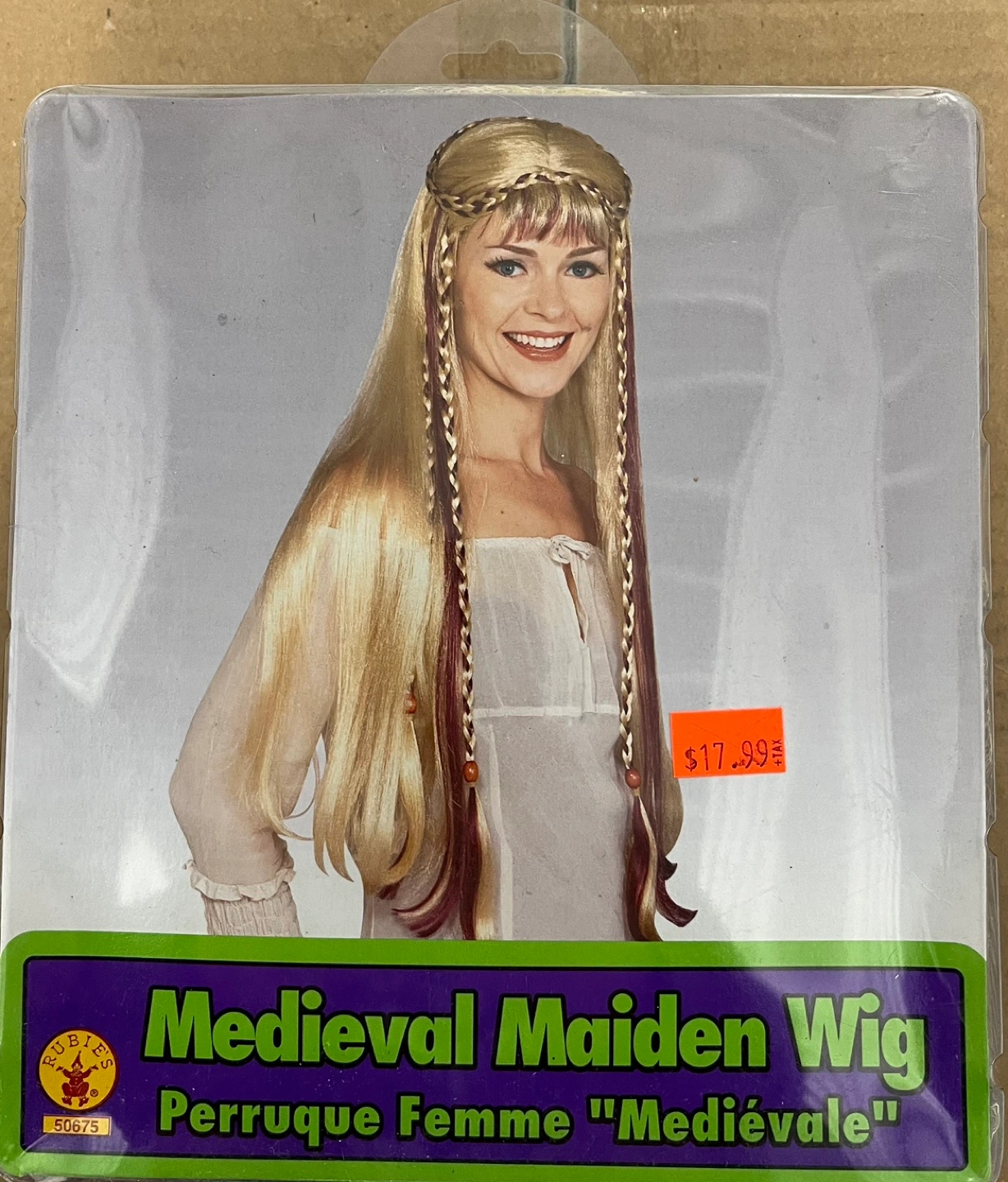 Blonde and burgundy medieval maiden wig. Long, straight hair with braids. New in package. Best quality for cosplay,theatre,reenacting.