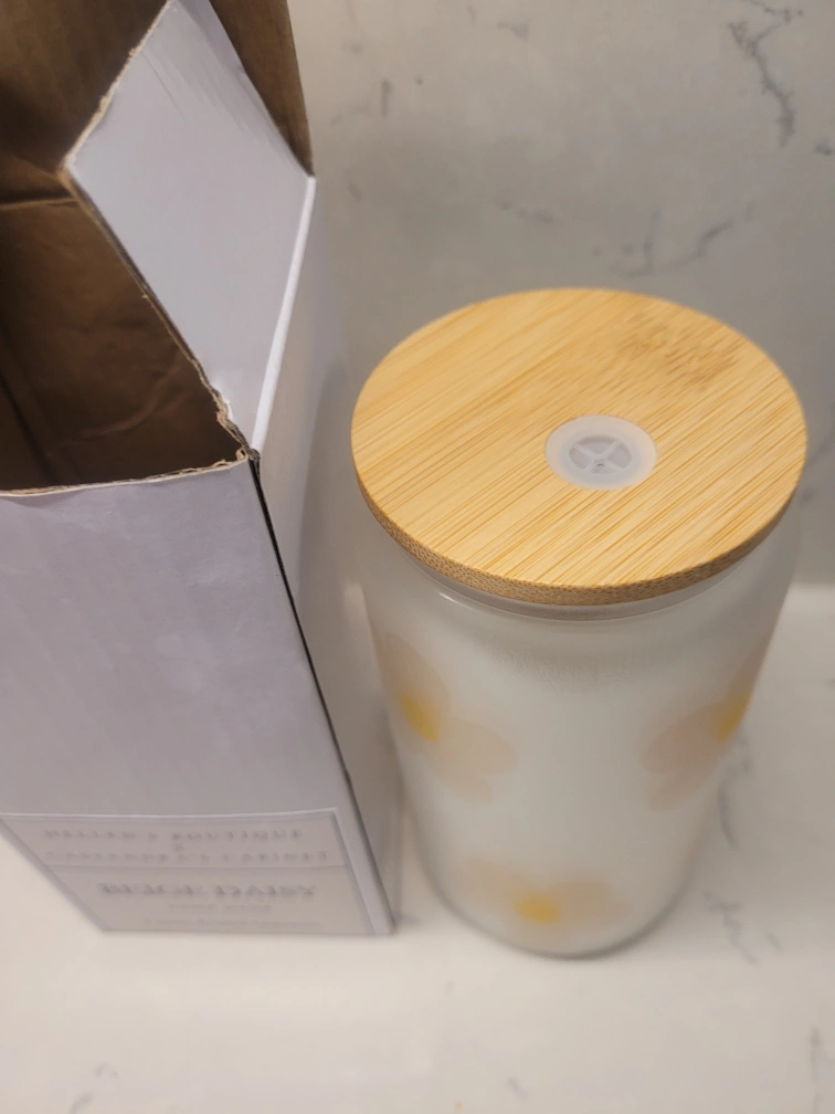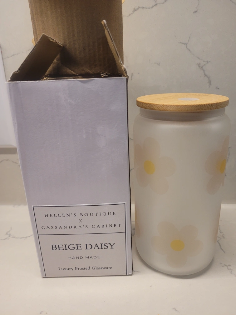 Hand-made luxury frosted glass jar. Features beige daisy pattern. Bamboo lid included. Hand wash only. From Hellen's Boutique x Cassandra's Cabinet.
