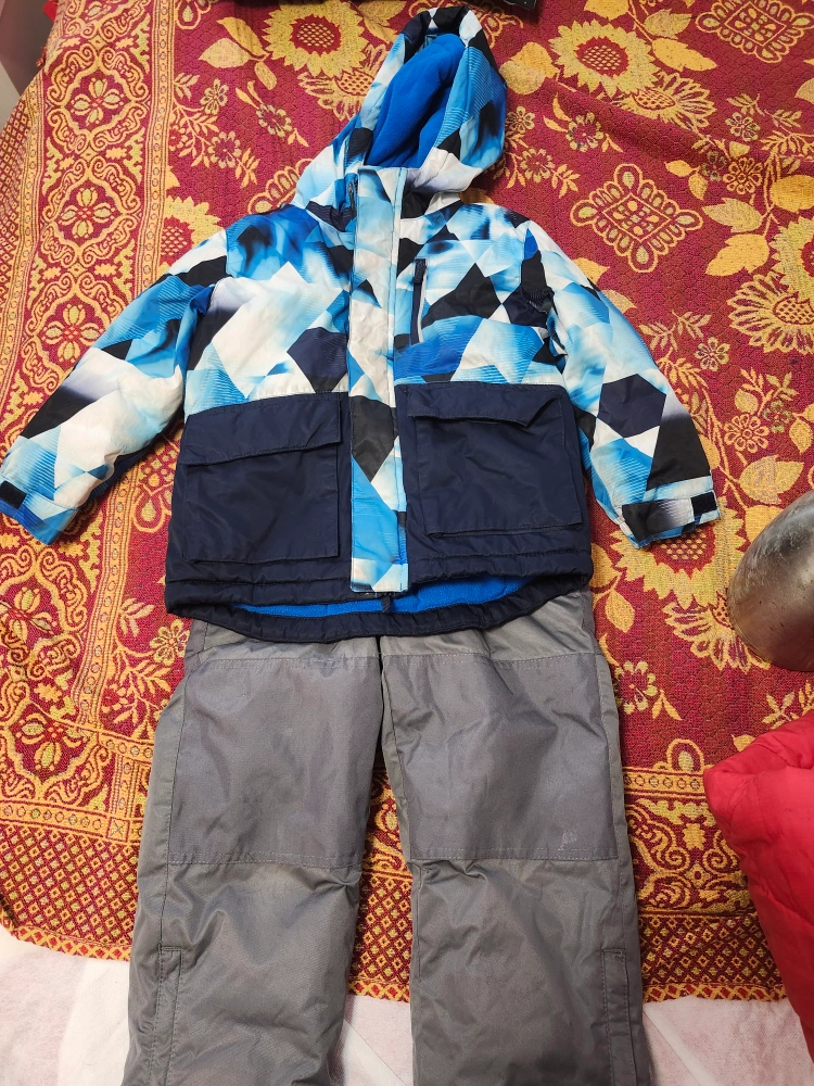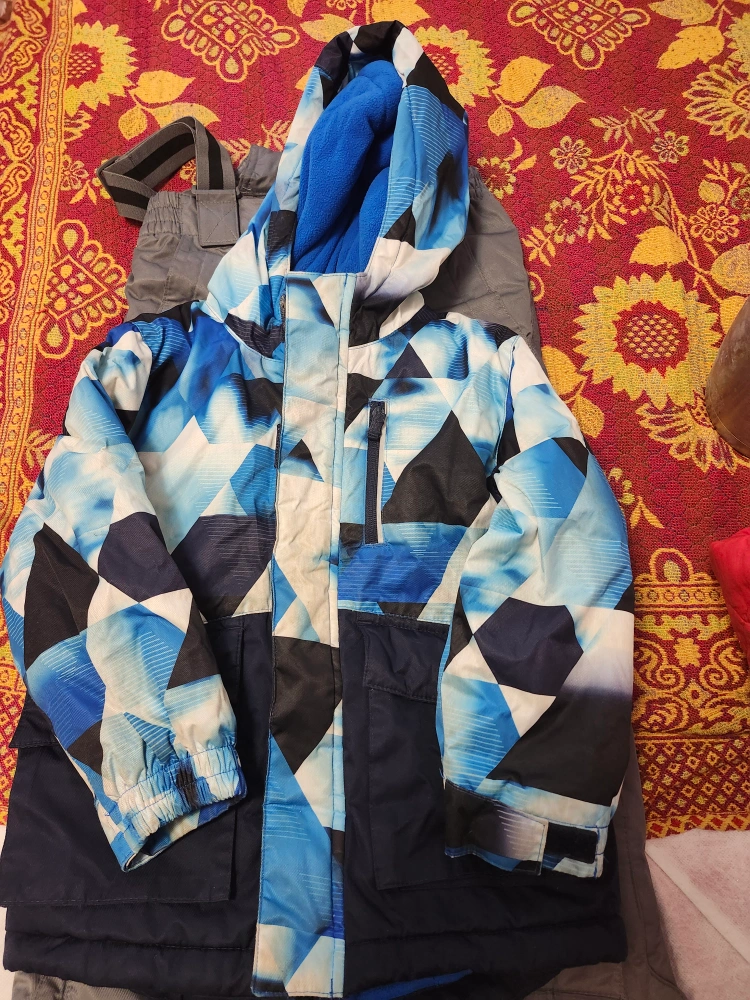snowsuit. Blue, white and black geometric print jacket. Grey snow pants. Great for winter. Pre-owned.