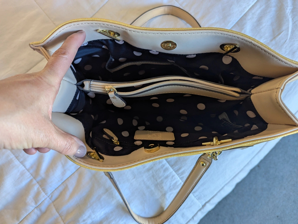 Stylish two-tone handbag. Beige bottom and yellow top. Features gold-toned hardware and chain detailing on the straps. Interior features a zippered pocket and polka dot lining. Perfect for everyday use.