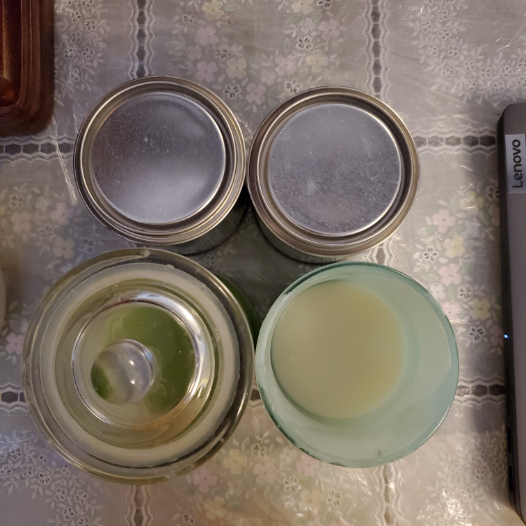 Five total candles. The two in the glass jars are half used but still have a lot of scent in them. I been using them on a warming plate so no wick. The two in the metal jars are DIY candles that I made but no longer want. Taper candle was mainly used to light other candles. Pick up only.
