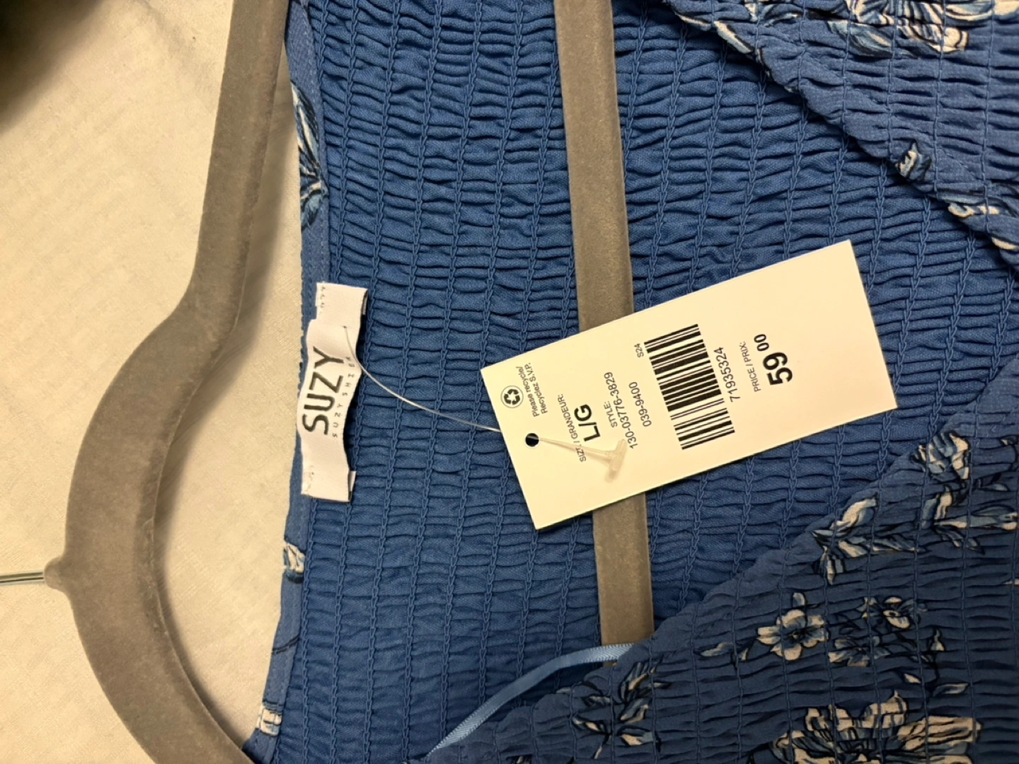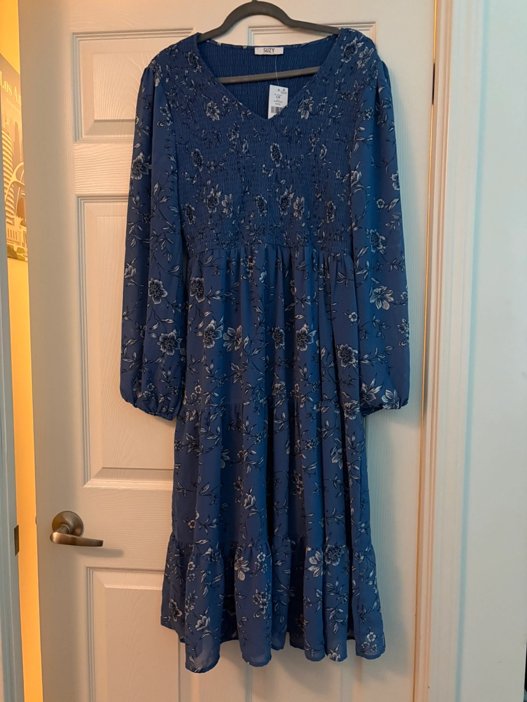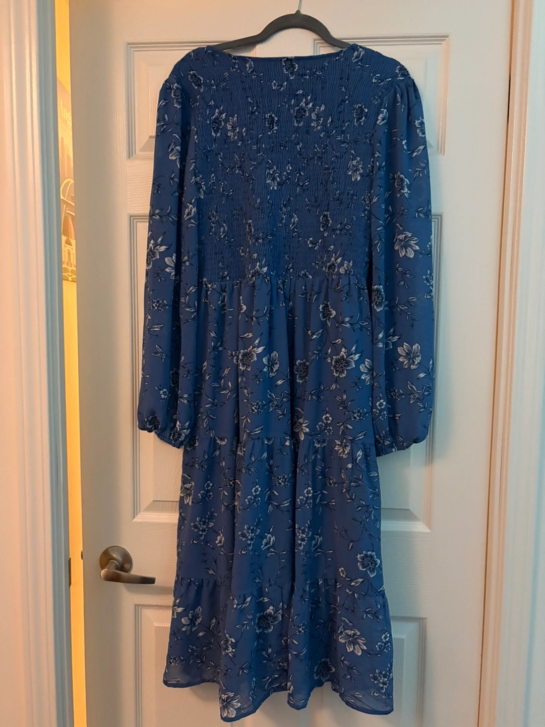 Beautiful blue floral midi dress. Long sleeves, smocked bodice, tiered skirt. Size large.
