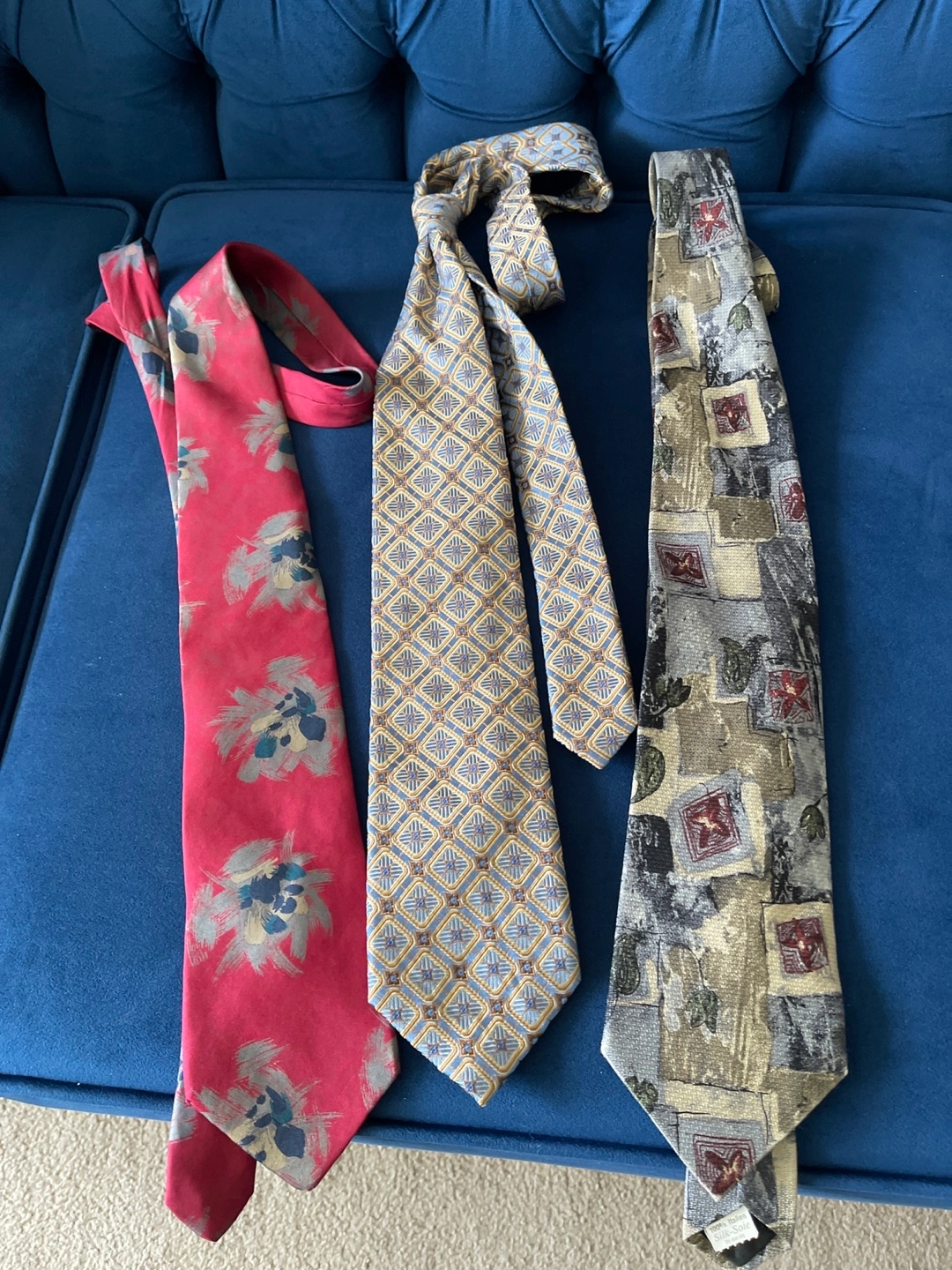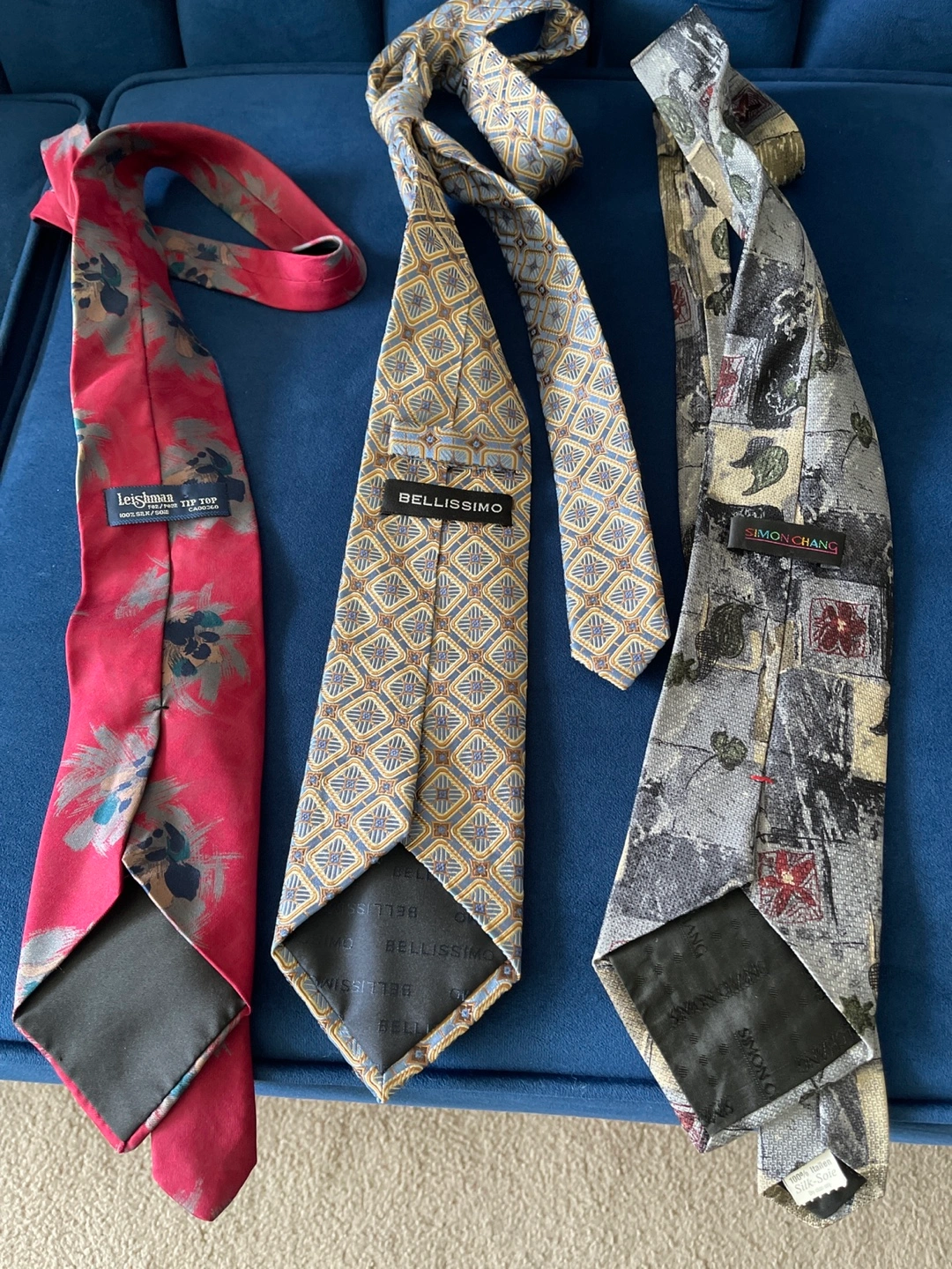 Bundle of three men's neckties. Leishman, bellissiimo, Simon Chang . Variety of colours and patterns. Good for adding to your wardrobe or for collectors.