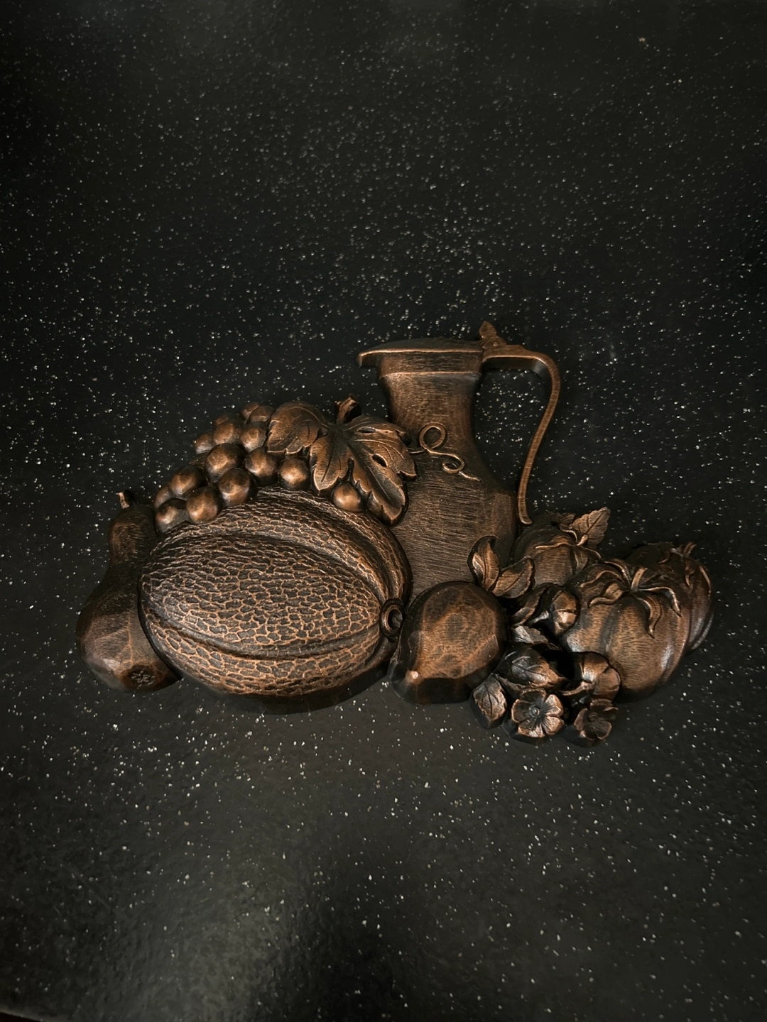Beautiful vintage wall hanging. Features grapes, melon, pear, and other fruits with a pitcher. Bronze coloured finish. Adds a touch of rustic charm to any room.