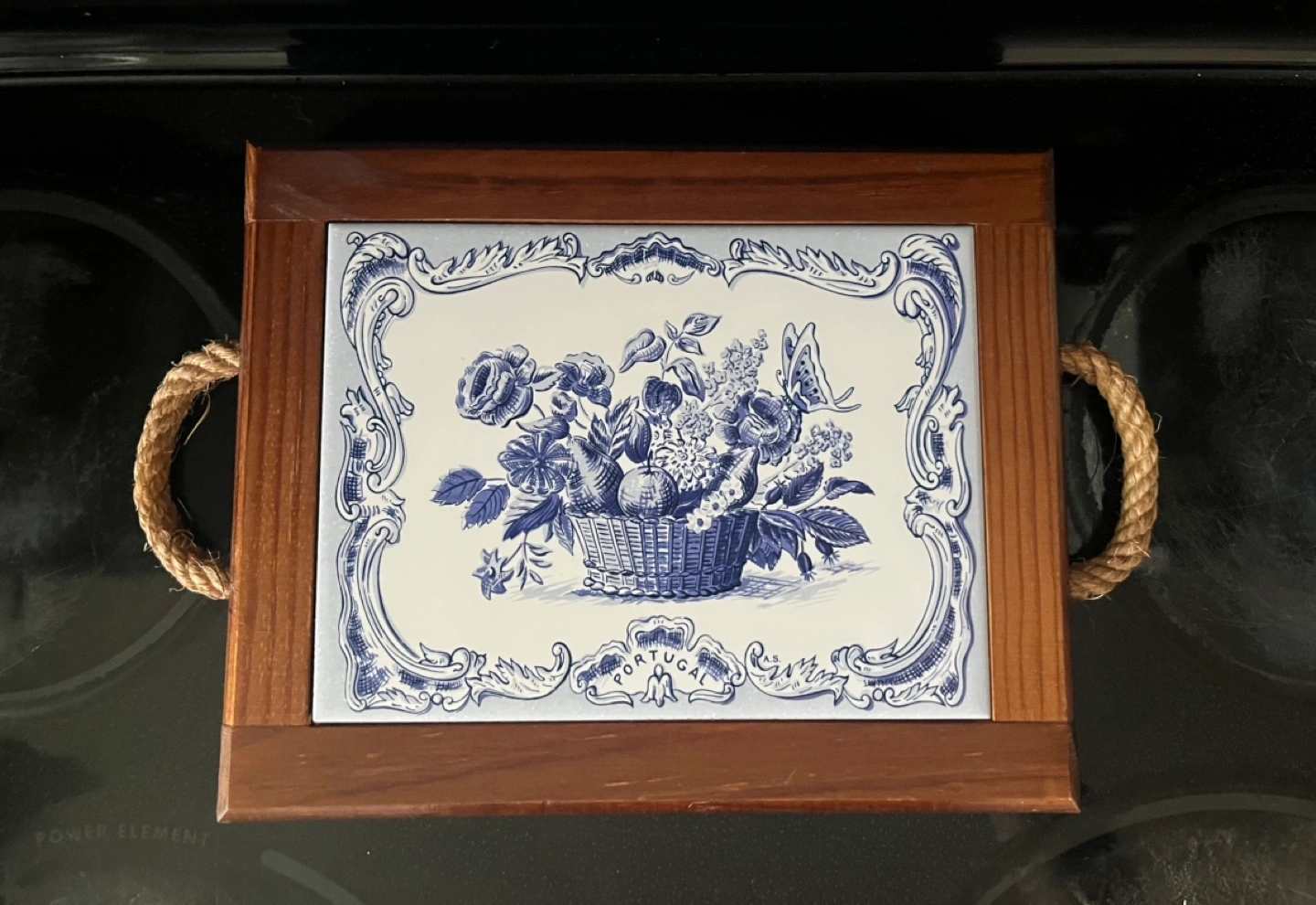 Beautiful vintage trivet. Features a hand-painted Portuguese tile depicting a fruit basket and flowers. Wooden frame with rope handles. Perfect for adding a touch of rustic charm to your kitchen.