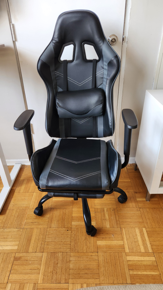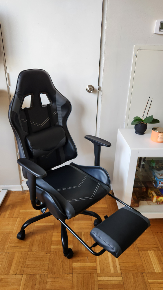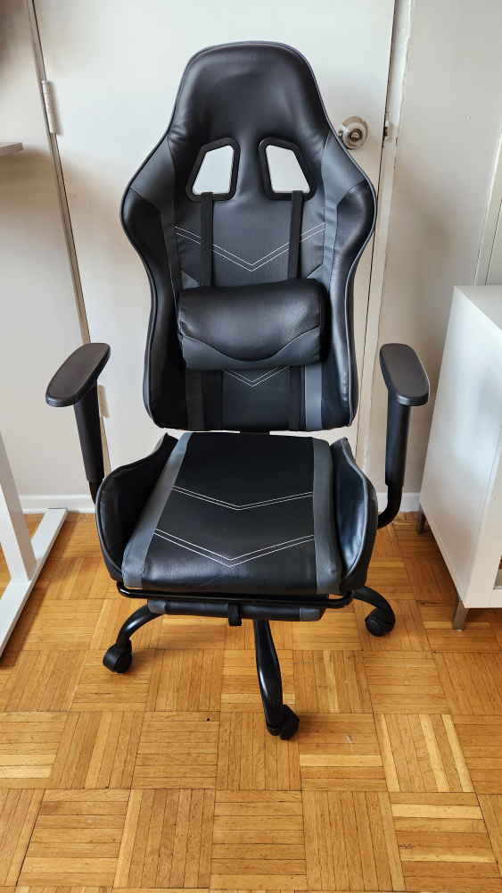 1 / 61 / 6Buy & SellGaming Chair with FootrestGaming Chair with Footrest$100Black and grey PU leather gaming chair. Adjustable height and reclining backrest. Includes a built-in footrest. Comfortable and supportive.ConditionLike newWHERE TO MEETTim Hortons in the corner of Carlton and JarvisView MapSELLERverifiedMauDowntown Toronto1103 reviews3 chats·0 favorites·55 viewsSEND CHAT TO SELLERHi Mau! I’m interested in your listing.Hi Mau! I’m interested in your listing.Get the Karrot app to chatSign In to chat