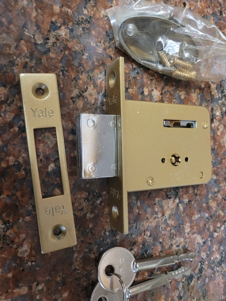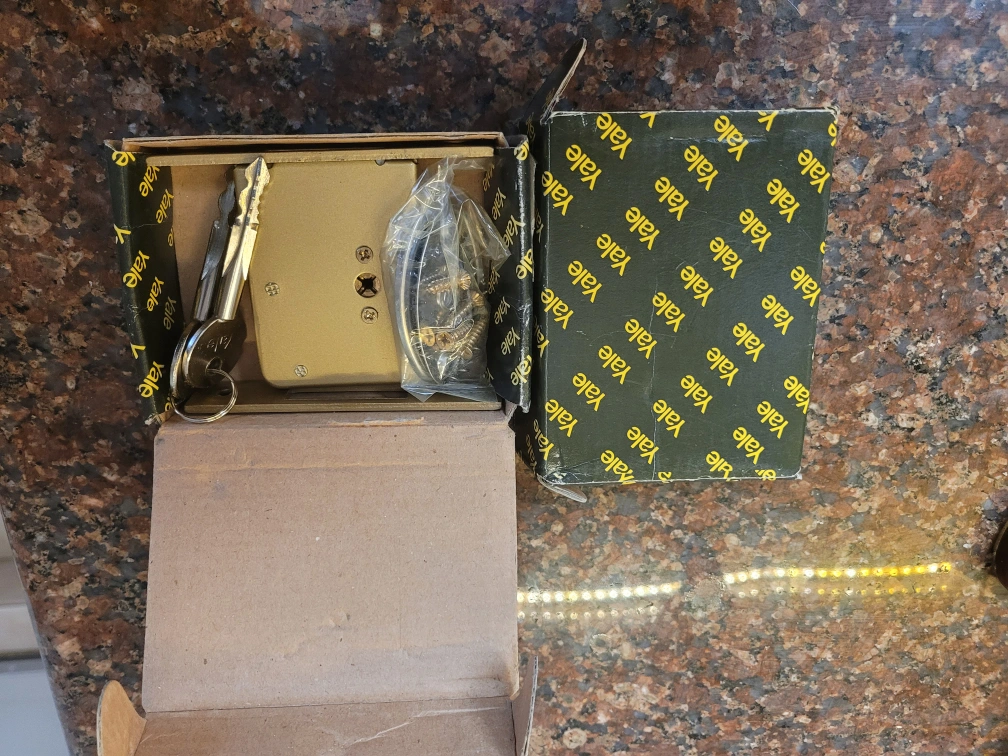 Gold finish. Includes two keys and mounting screws. Comes in original packaging.