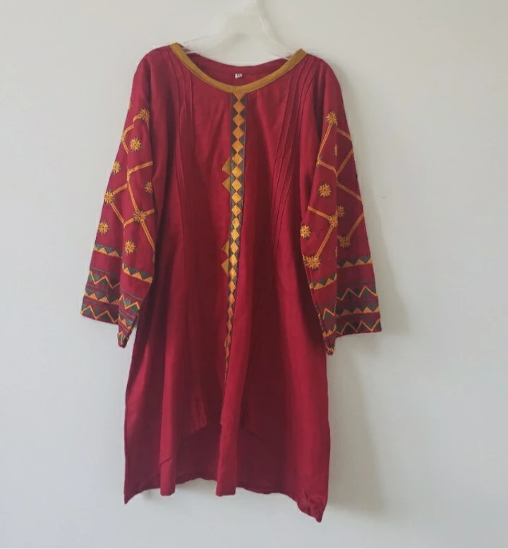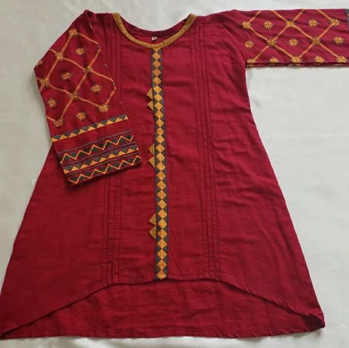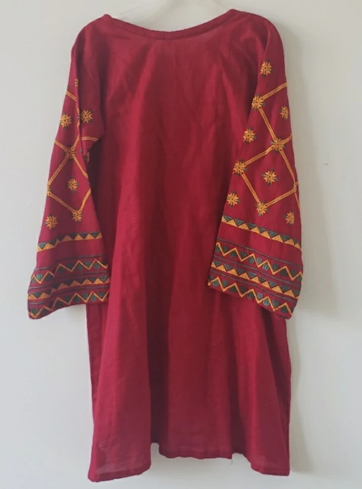Gorgeous maroon kurti in cotton khaadi. Features embroidered details on sleeves and front. Three-quarter sleeves. High-low hemline. Beautiful colours and stitching.