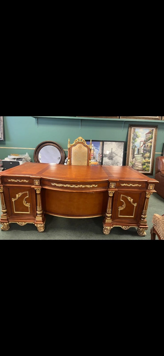 Large, ornate executive desk. Features a curved front, gold accents, and two side cabinets. Includes a matching high-back chair. Beautiful piece for a home or office.