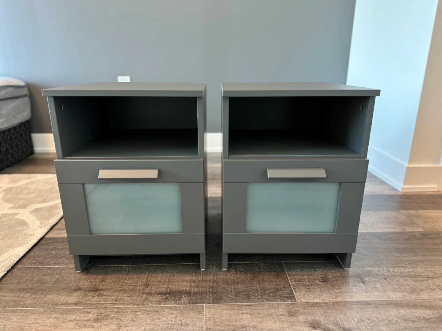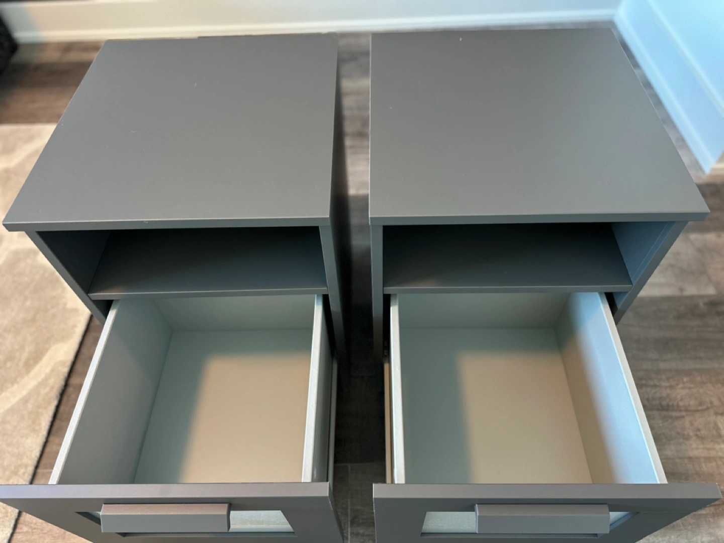 116Two matching nightstands, dark grey finish. Each features one drawer and an open shelf. Simple, modern design. Great for bedrooms or small spaces.