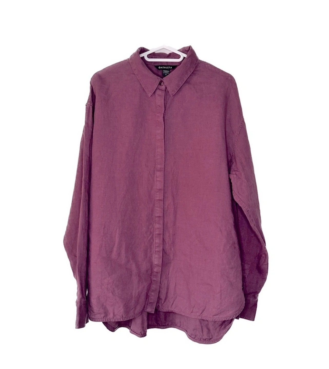Linen fabric. Long sleeve button-down shirt. Oversized fit. Plum colored. Button closure. Relaxed style. Good condition.