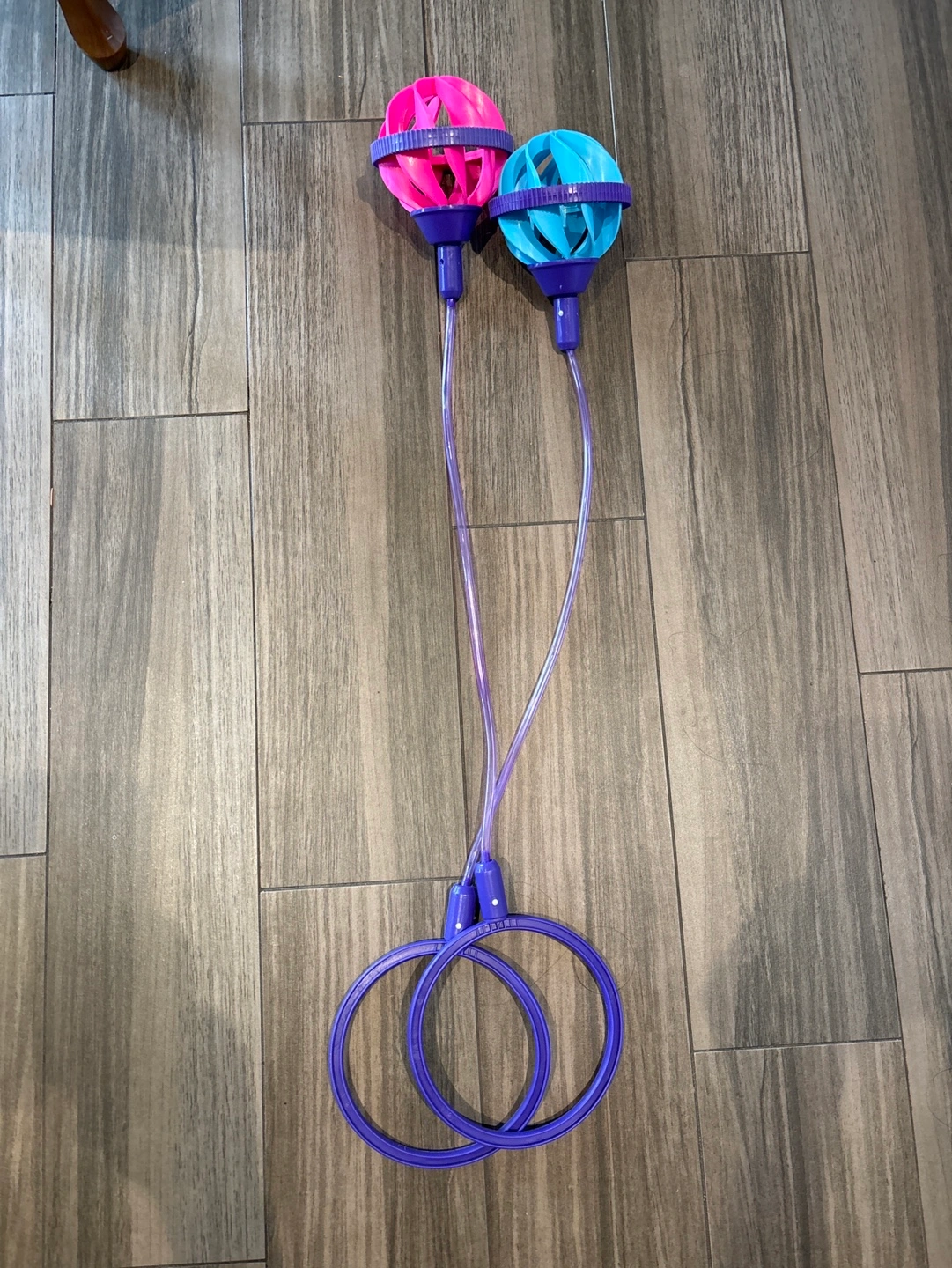 Fun and colourful jump ropes. Perfect for kids. Two ropes with pink and blue ball handles. Purple hoops.