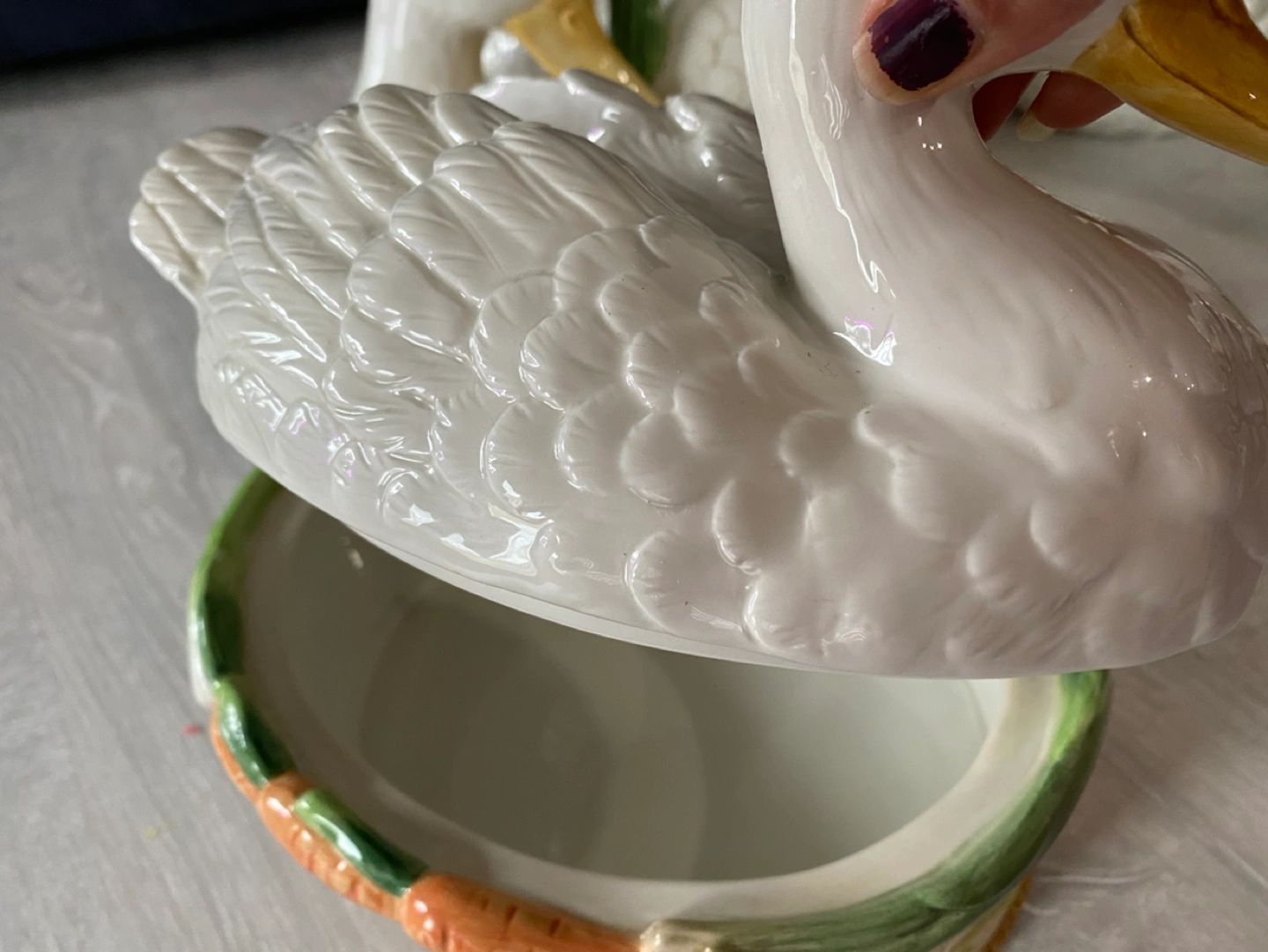 Five-piece ceramic duck serving set. Features adorable duck designs with carrots and greens. Includes a large serving bowl, two smaller serving bowl, and two individual serving pieces. Perfect for a whimsical kitchen or dining room.
