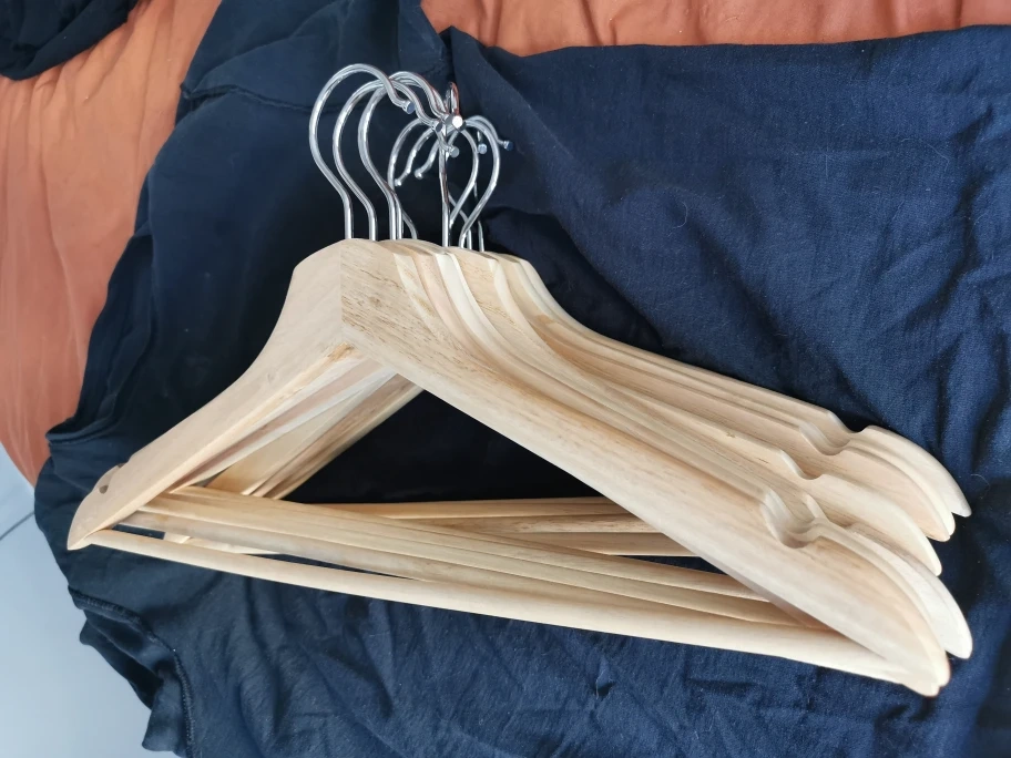 Set of wooden hangers. Natural colour. Metal hooks. Great for closet organization. Set of 10 for $10 or 28 for $25.