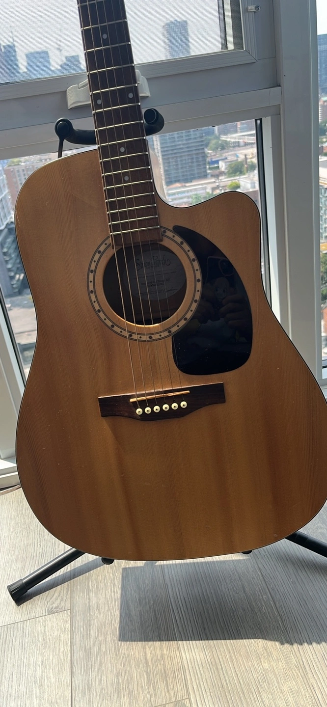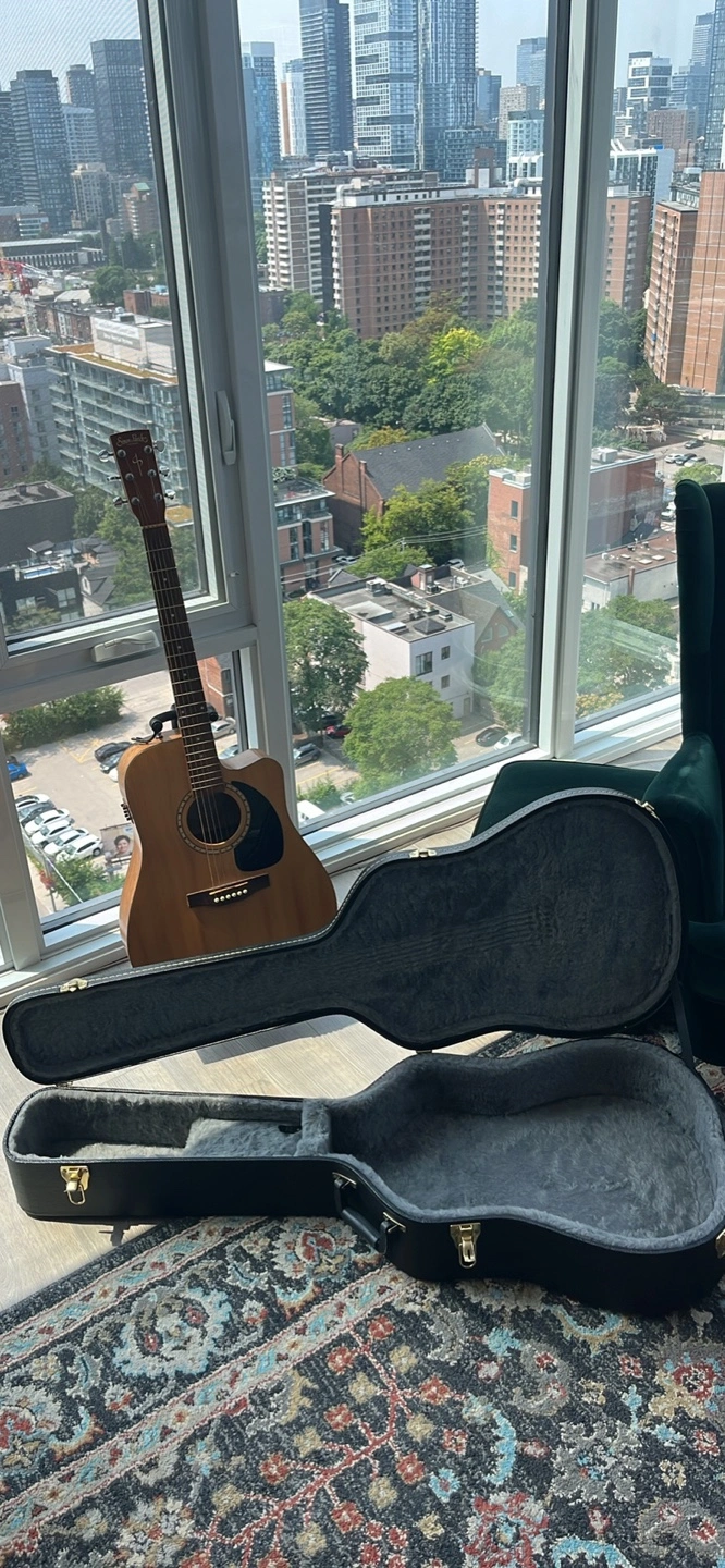 Acoustic guitar, great condition. Includes hard shell case. Made in Quebec. Features onboard tuner and preamp.