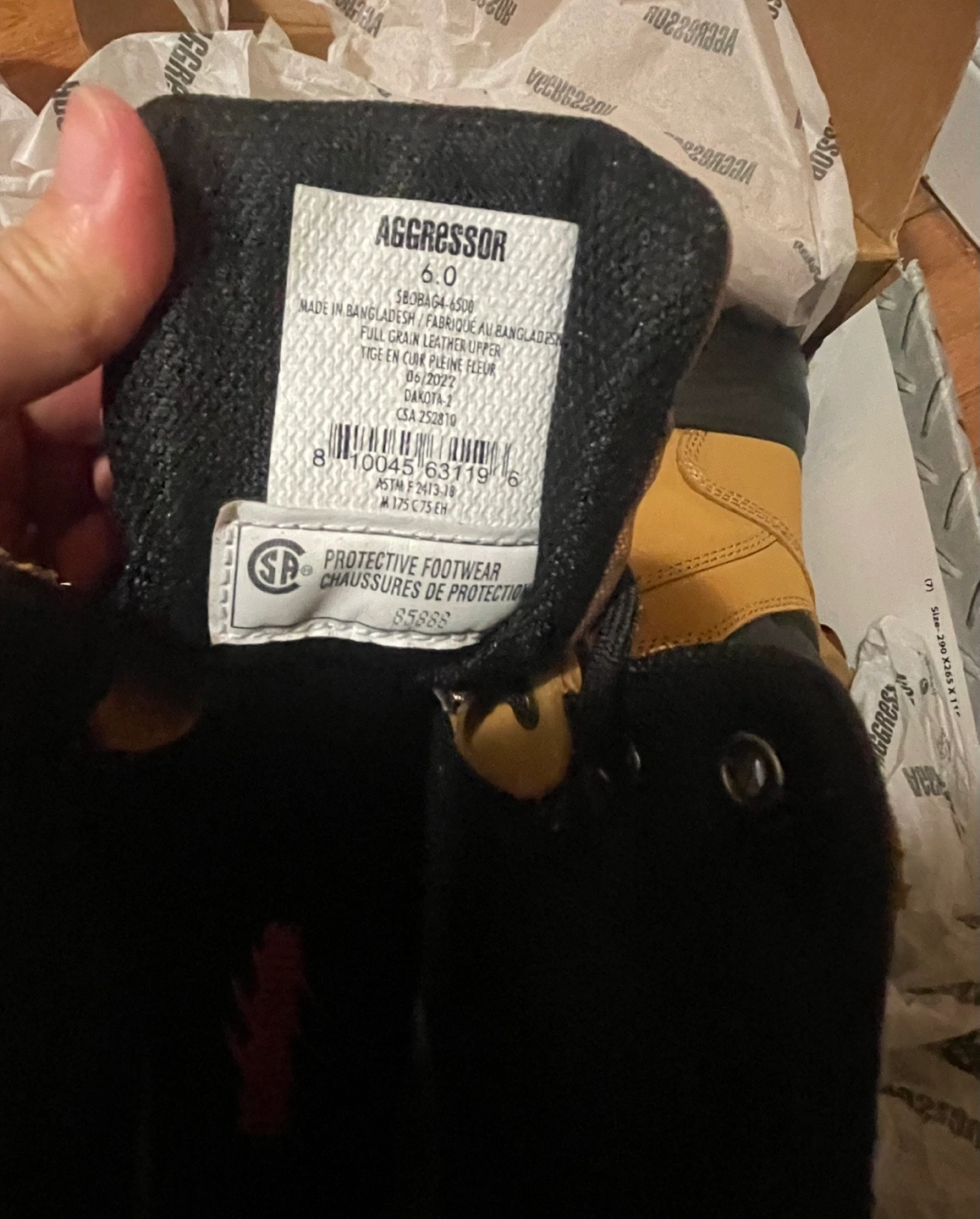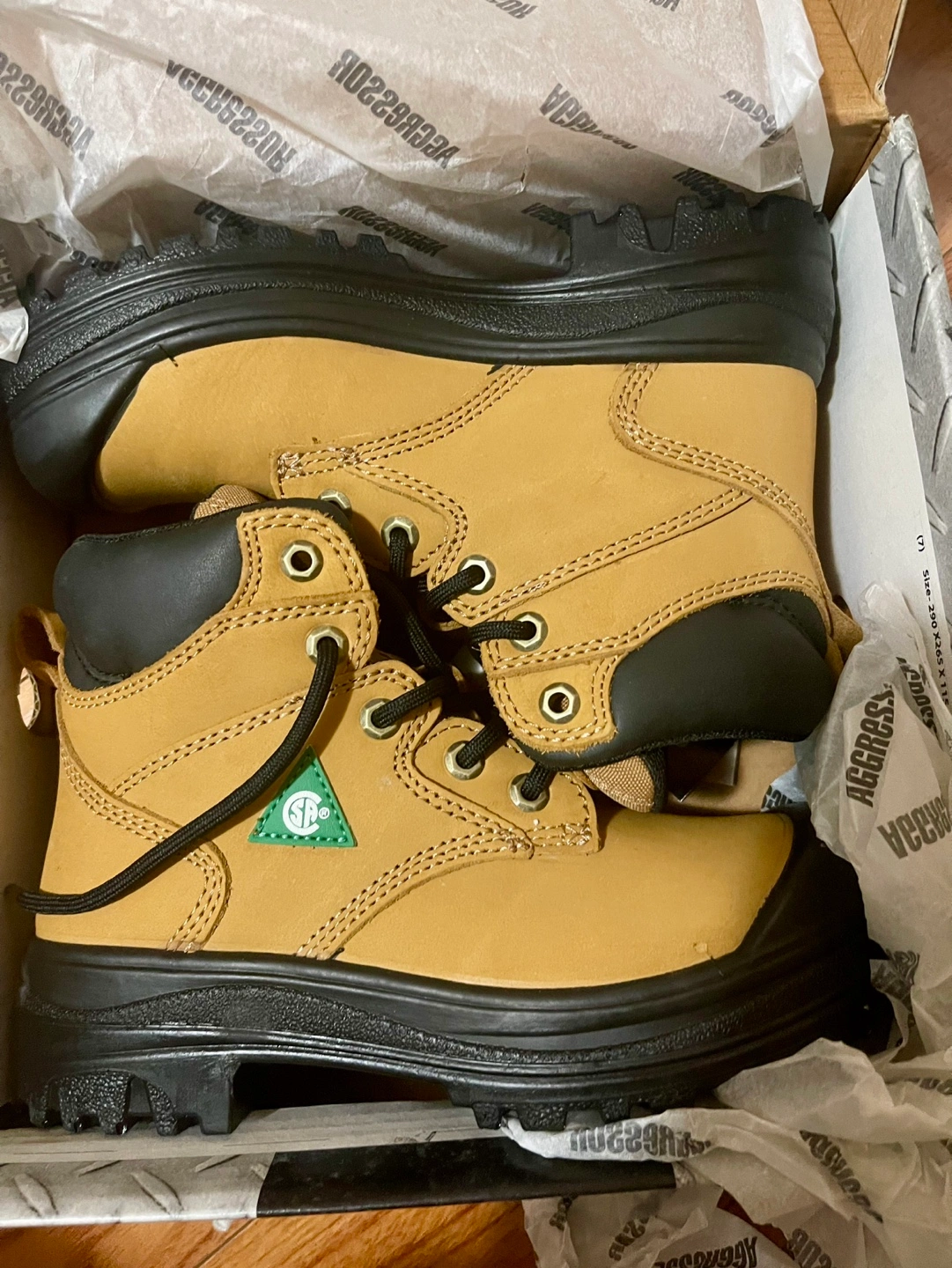 New Aggressor brand safety boots. Size 6.0. Tan leather uppers, black soles. Protective footwear.