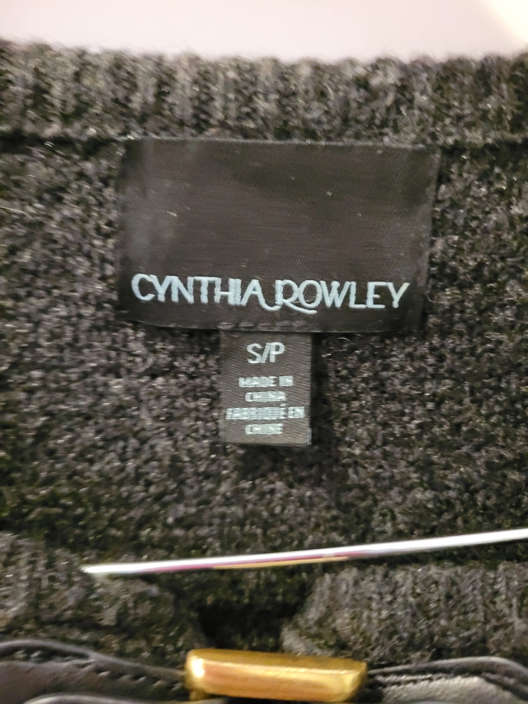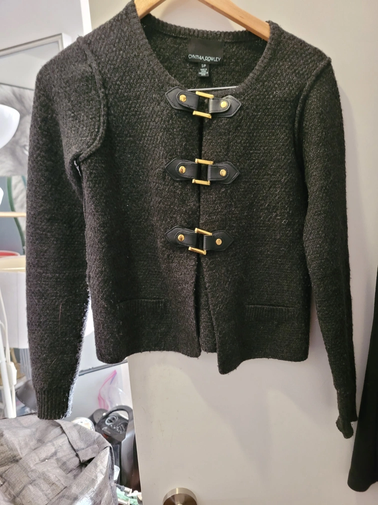 Black women's cardigan sweater. Size small/petite. Features gold buckle detailing. Soft material. Great for layering. **** Cash Only **** **** Pickup Only **** **** No E-transfers **** **** Serious Inquiries Only!!!! ****