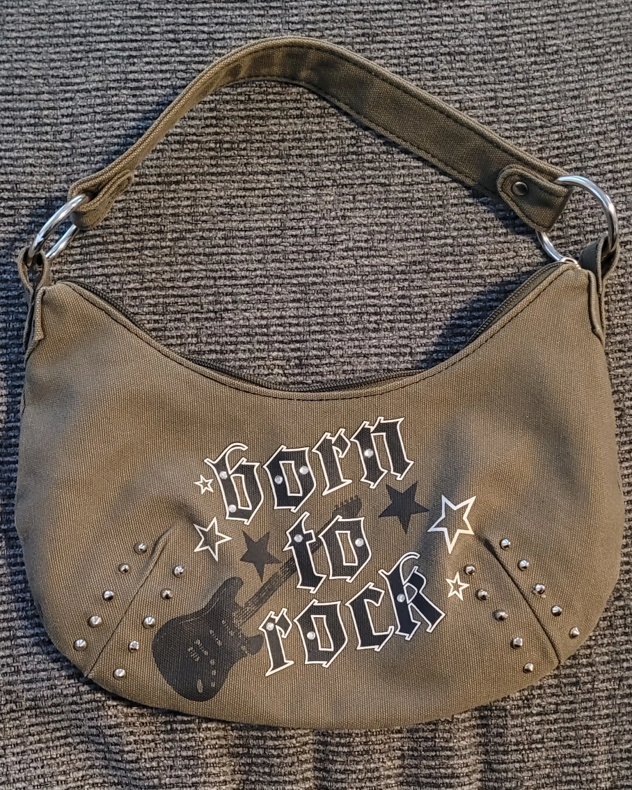 Small olive green canvas shoulder bag. Features a zipper closure and 'Born to Rock' graphic design. One interior zipper pocket. Metal studs along the bottom. Interior label reads 'Whatever'.