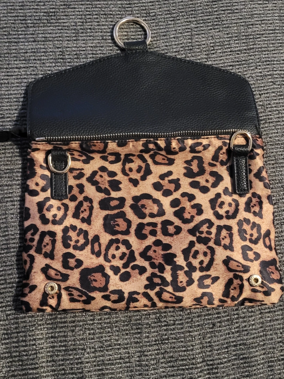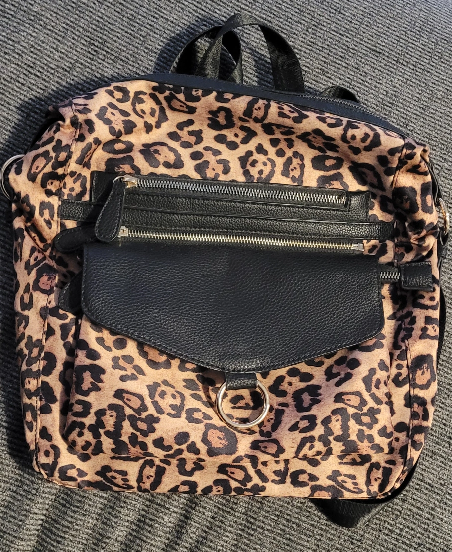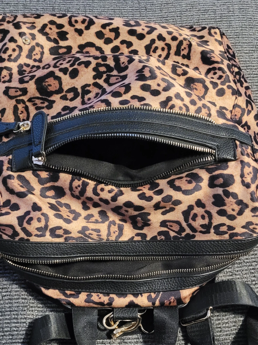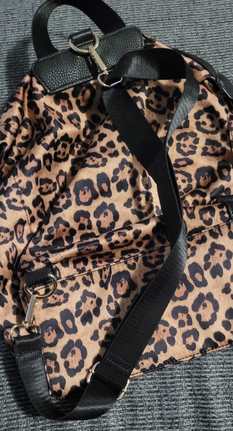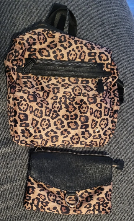 Stylish leopard print backpack and matching clutch. Both feature black faux leather accents. Backpack has two zippered compartments and two clip on straps that can be used on the smaller clutch bag. Or you can turn the backpack into a sling bag. Detachable clutch has a cute ring detail. Perfect for everyday use or a night out.